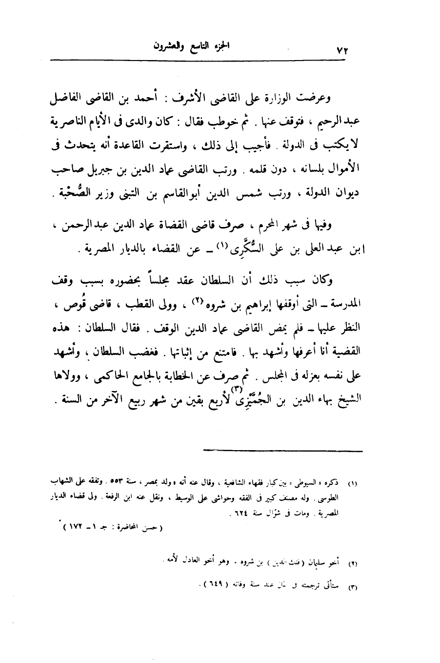 وكان سبب ذلك أن السلطان عقد مجلسا بحضوره بسبب وقف المدرسة- التى أوقفها إبراهيم بن شروه «2» ، وولى القطب، قاضى قوص، النظر عليها- فلم يمض القاضى عماد الدين الوقف. فقال السلطان: هذه القضية أنا أعرفها وأشهد بها. فامتنع من إثباتها. فغضب السلطان، وأشهد على نفسه بعزله فى المجلس. ثم صرف عن الخطابة بالجامع الحاكمى، وولاها الشيخ بهاء الدين بن الجمّيزى «3» لأربع بقين من شهر ربيع الآخر من السنة.