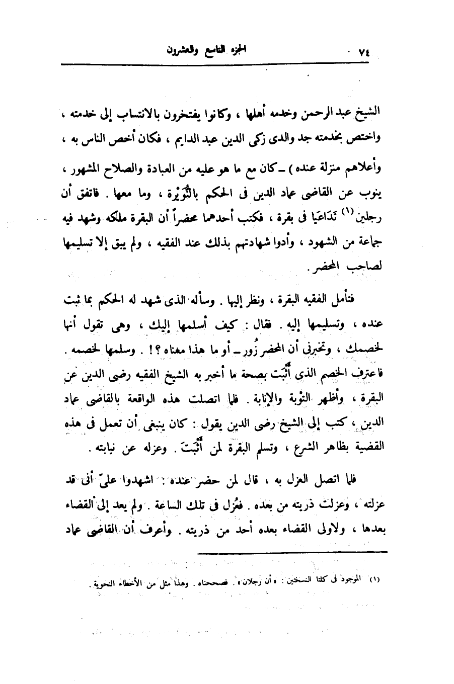 الشيخ عبد الرحمن وخدمه أهلها، وكانوا يفتخرون بالانتساب إلى خدمته، واختص بخدمته جد والدى زكى الدين عبد الدايم، فكان أخص الناس به، وأعلاهم منزلة عنده) كان مع ما هو عليه من العبادة والصلاح المشهور، ينوب عن القاضى عماد الدين فى الحكم بالنّويرة، وما معها. فاتفق أن رجلين «1» تداعيا فى بقرة، فكتب أحدهما محضرا أن البقرة ملكه وشهد فيه جماعة من الشهود، وأدوا شهادتهم بذلك عند الفقيه، ولم يبق إلا تسليمها لصاحب المحضر.