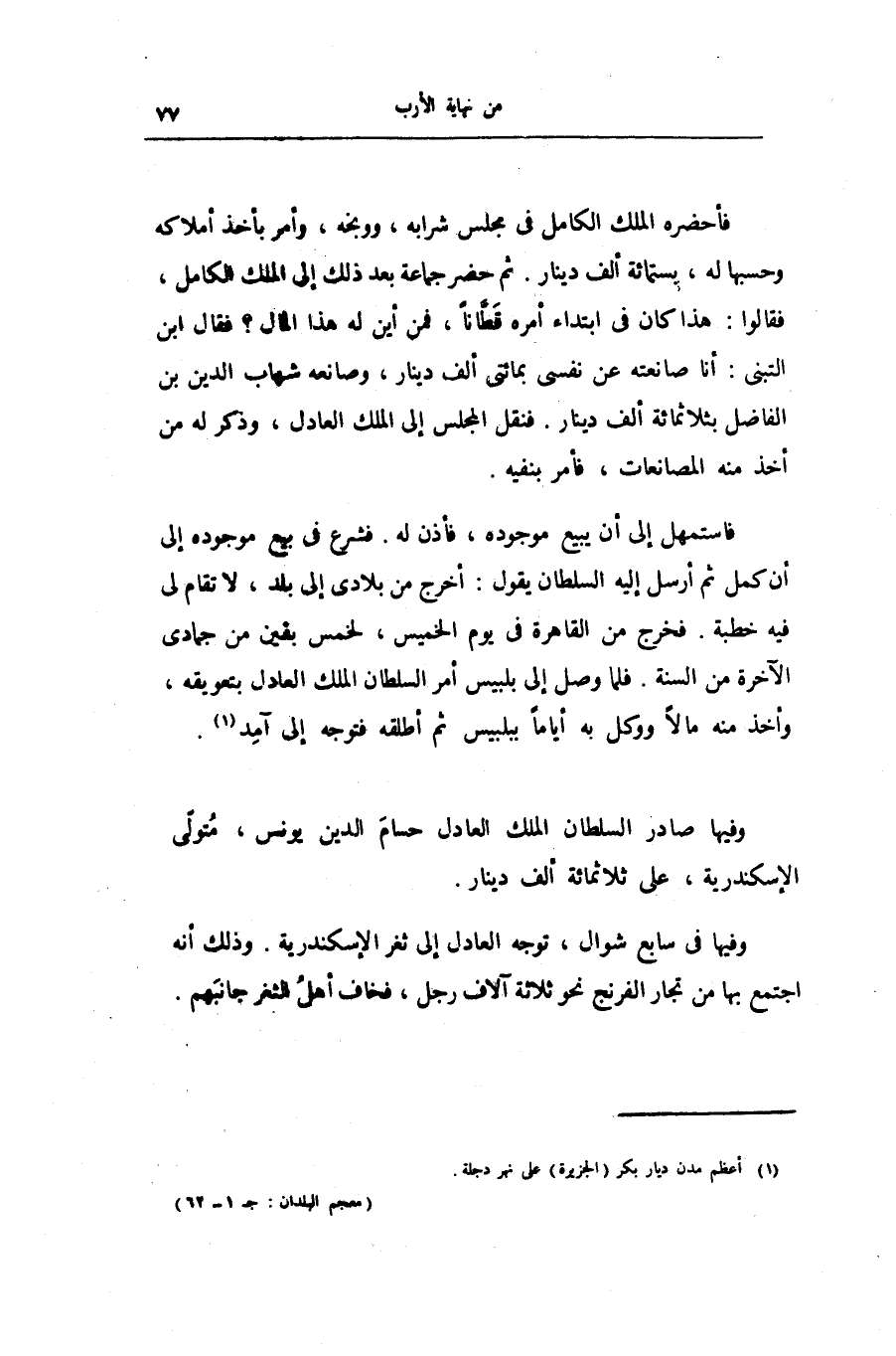 فاستمهل إلى أن يبيع موجوده، فأذن له. فشرع فى بيع موجوده إلى أن كمل ثم أرسل إليه السلطان يقول: أخرج من بلادى إلى بلد، لا تقام لى فيه خطبة. فخرج من القاهرة فى يوم الخميس، لخمس بقين من جمادى الآخرة من السنة. فلما وصل إلى بلبيس أمر السلطان الملك العادل بتعويقه، وأخذ منه مالا ووكل به أياما ببلبيس ثم أطلقه فتوجه إلى آمد «1» .