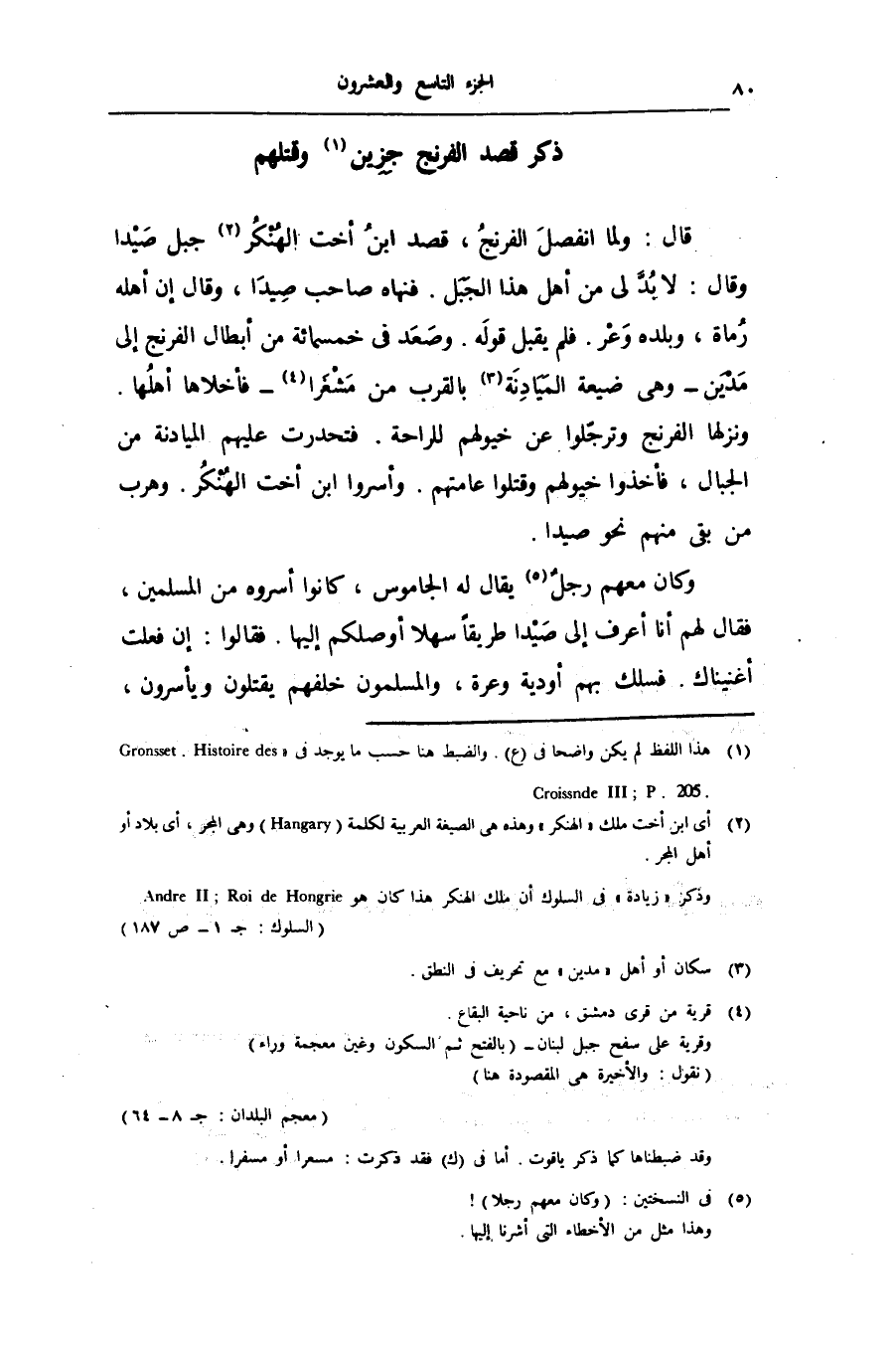 قال: ولما انفصل الفرنج، قصد ابن أخت الهنكر «2» جبل صيدا وقال: لا بدّ لى من أهل هذا الجبل. فنهاه صاحب صيدا، وقال إن أهله رماة، وبلده وعر. فلم يقبل قوله. وصعد فى خمسمائة من أبطال الفرنج إلى مدين- وهى ضيعة الميادنة «3» بالقرب من مشغرا «4» - فأخلاها أهلها.