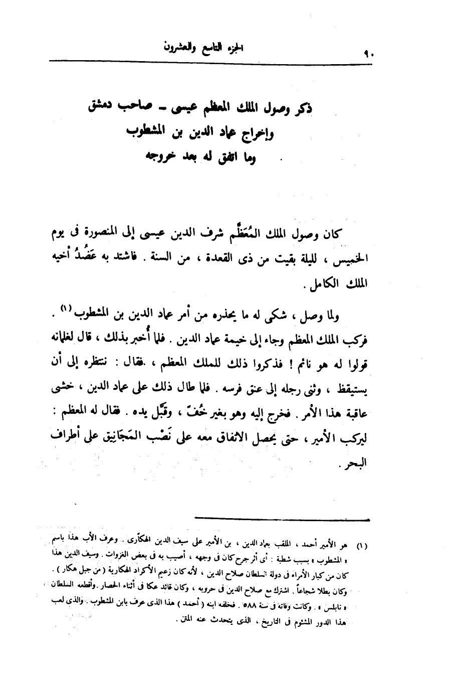 فركب الملك المعظم وجاء إلى خيمة عماد الدين. فلما أخبر بذلك، قال لغلمانه قولوا له هو نائم! فذكروا ذلك للملك المعظم، فقال: ننتظره إلى أن يستيقظ، وثنى رجله إلى عنق فرسه. فلما طال ذلك على عماد الدين، خشى عاقبة هذا الأمر. فخرج إليه وهو بغير خفّ، وقبّل يده. فقال له المعظم: