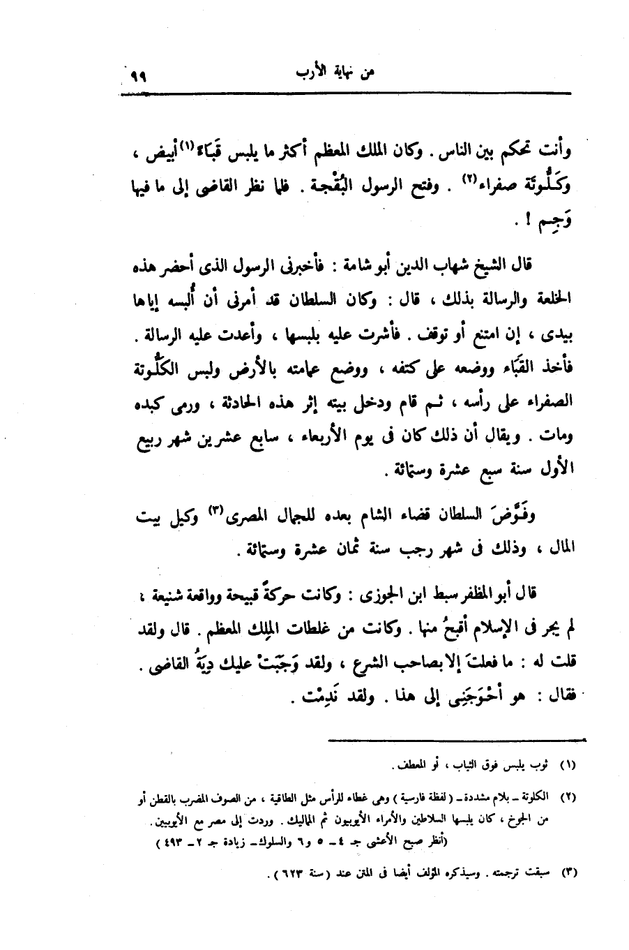قال الشيخ شهاب الدين أبو شامة: فأخبرنى الرسول الذى أحضر هذه الخلعة والرسالة بذلك، قال: وكان السلطان قد أمرنى أن ألبسه إياها بيدى، إن امتنع أو توقف. فأشرت عليه بلبسها، وأعدت عليه الرسالة.