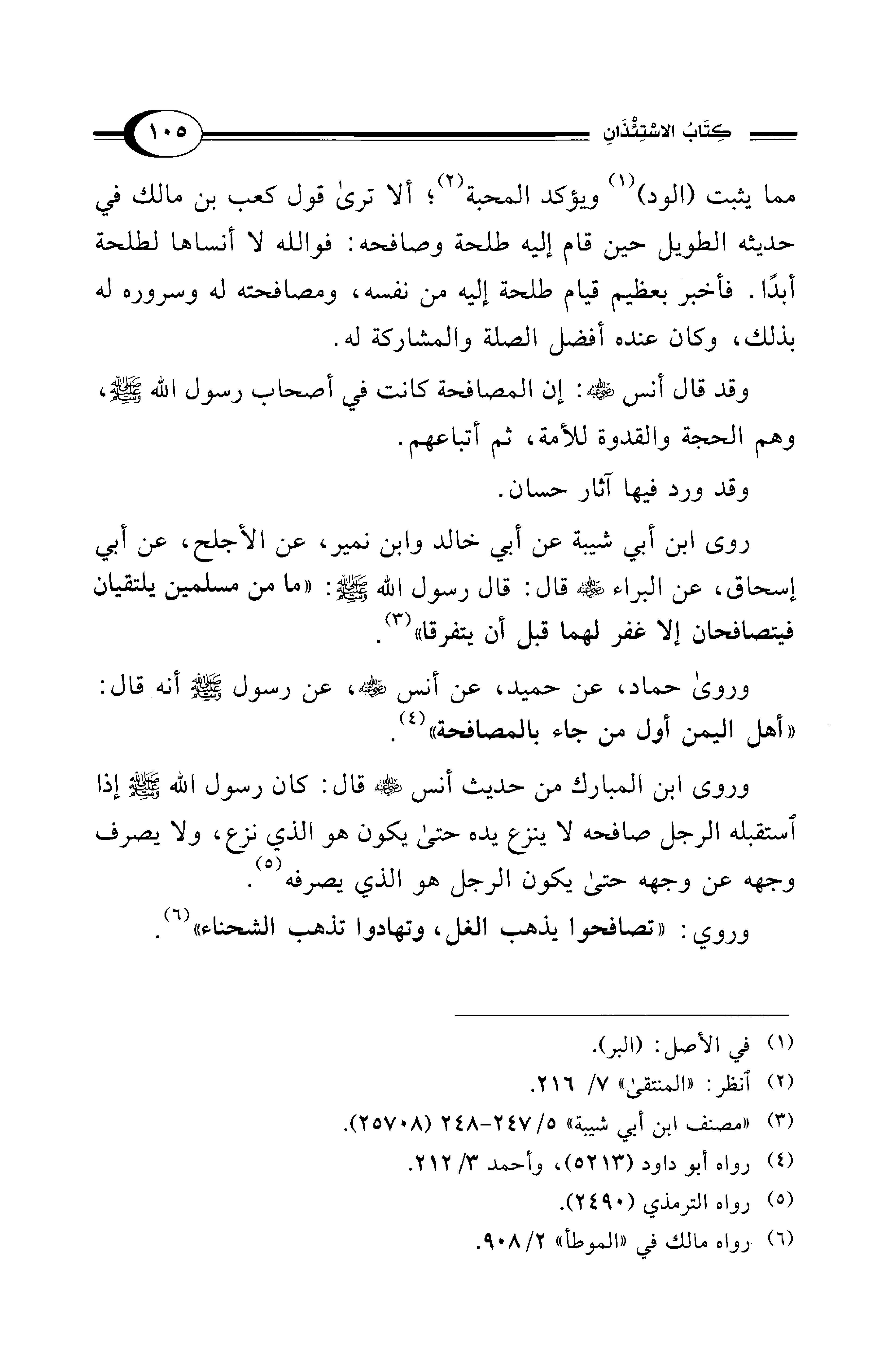 وقد قال أنس - رضي الله عنه -: إن المصافحة كانت في أصحاب رسول الله - صلى الله عليه وسلم -، وهم الحجة والقدوة للأمة، ثم أتباعهم.