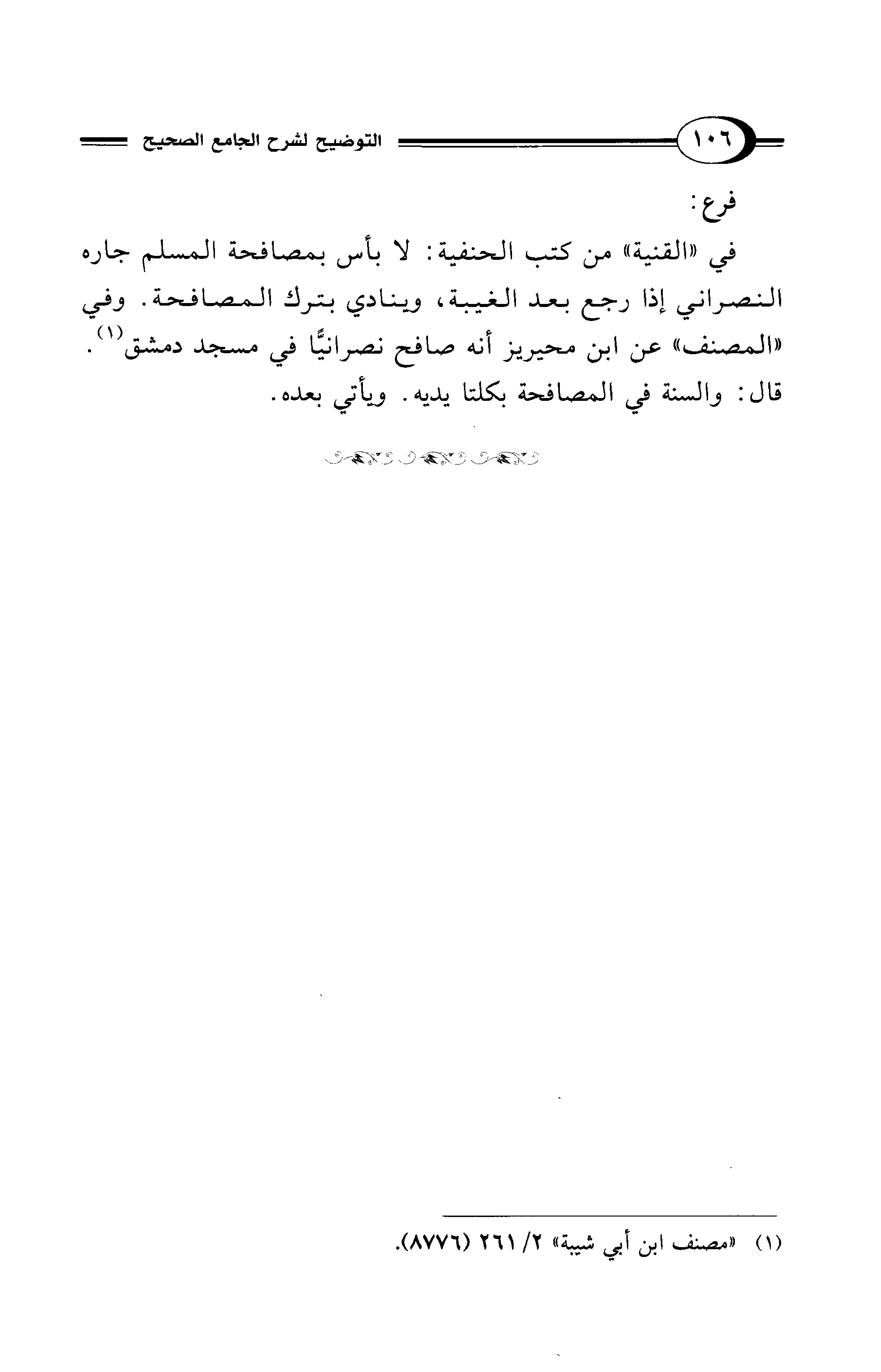 في "القنية" من كتب الحنفية: لا بأس بمصافحة المسلم جاره النصراني إذا رجع بعد الغيبة، وينادي بترك المصافحة. وفي "المصنف" عن ابن محيريز أنه صافح نصرانيًّا في مسجد دمشق (¬1). قال: والسنة في المصافحة بكلتا يديه. ويأتي بعده.