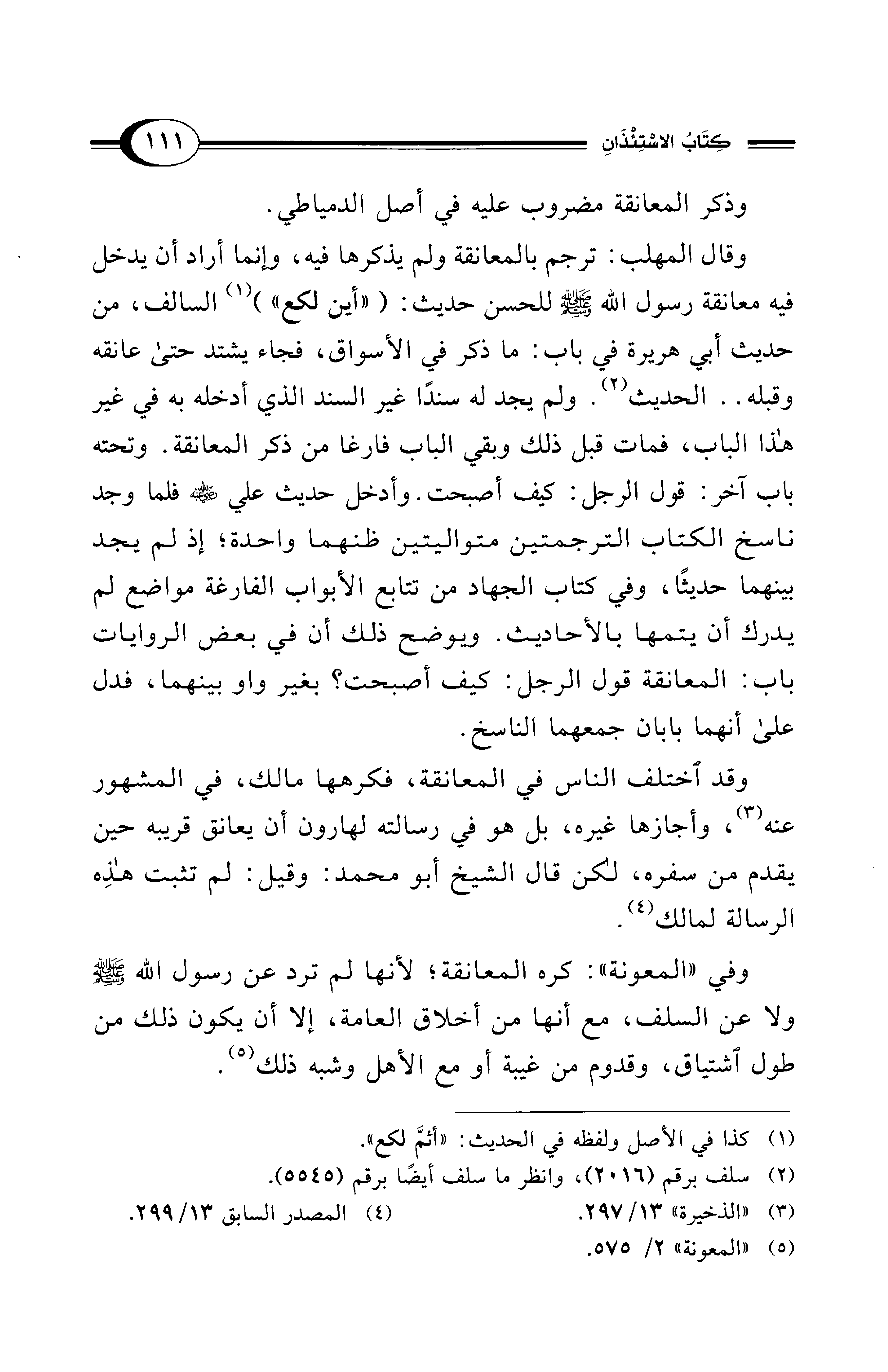 وقد اختلف الناس في المعانقة، فكرهها مالك، في المشهور عنه (¬3)، وأجازها غيره، بل هو في رسالته لهارون أن يعانق قريبه حين يقدم من سفره، لكن قال الشيخ أبو محمد: وقيل: لم تثبت هذِه الرسالة لمالك (¬4).