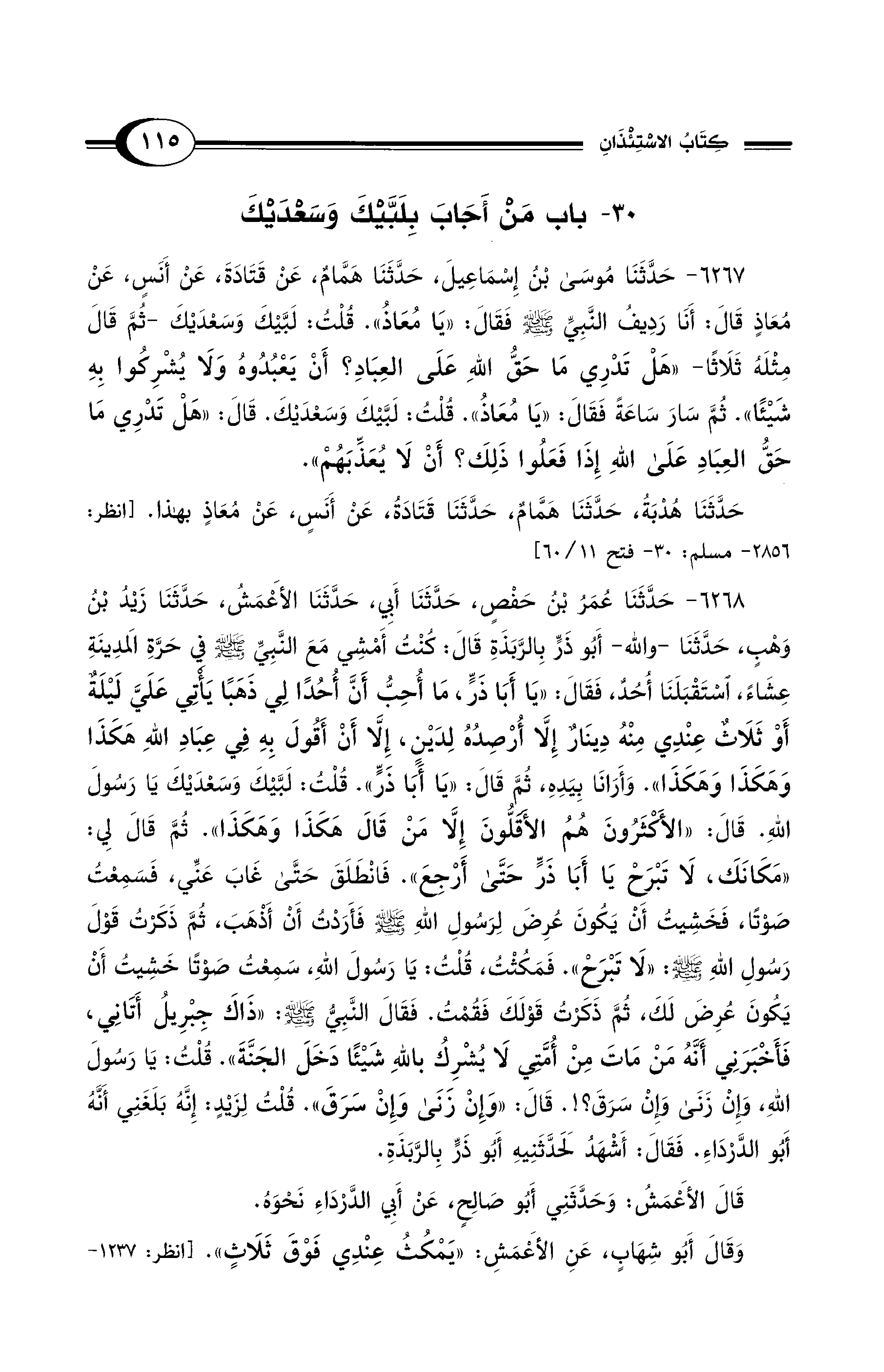 6267 - حَدَّثَنَا مُوسَى بْنُ إِسْمَاعِيلَ، حَدَّثَنَا هَمَّامٌ، عَنْ قَتَادَةَ، عَنْ أَنَسٍ، عَنْ مُعَاذٍ قَالَ: أَنَا رَدِيفُ النَّبِيِّ - صلى الله عليه وسلم - فَقَالَ: «يَا مُعَاذُ». قُلْتُ: لَبَّيْكَ وَسَعْدَيْكَ -ثُمَّ قَالَ مِثْلَهُ ثَلاَثًا- «هَلْ تَدْرِي مَا حَقُّ اللهِ على العِبَادِ؟ أَنْ يَعْبُدُوهُ وَلاَ يُشْرِكُوا بِهِ شَيْئًا». ثُمَّ سَارَ سَاعَةً فَقَالَ: «يَا مُعَاذُ». قُلْتُ: لَبَّيْكَ وَسَعْدَيْكَ. قَالَ: «هَلْ تَدْرِي مَا حَقُّ الْعِبَادِ على اللهِ إِذَا فَعَلُوا ذَلِكَ؟ أَنْ لاَ يُعَذِّبَهُمْ».
