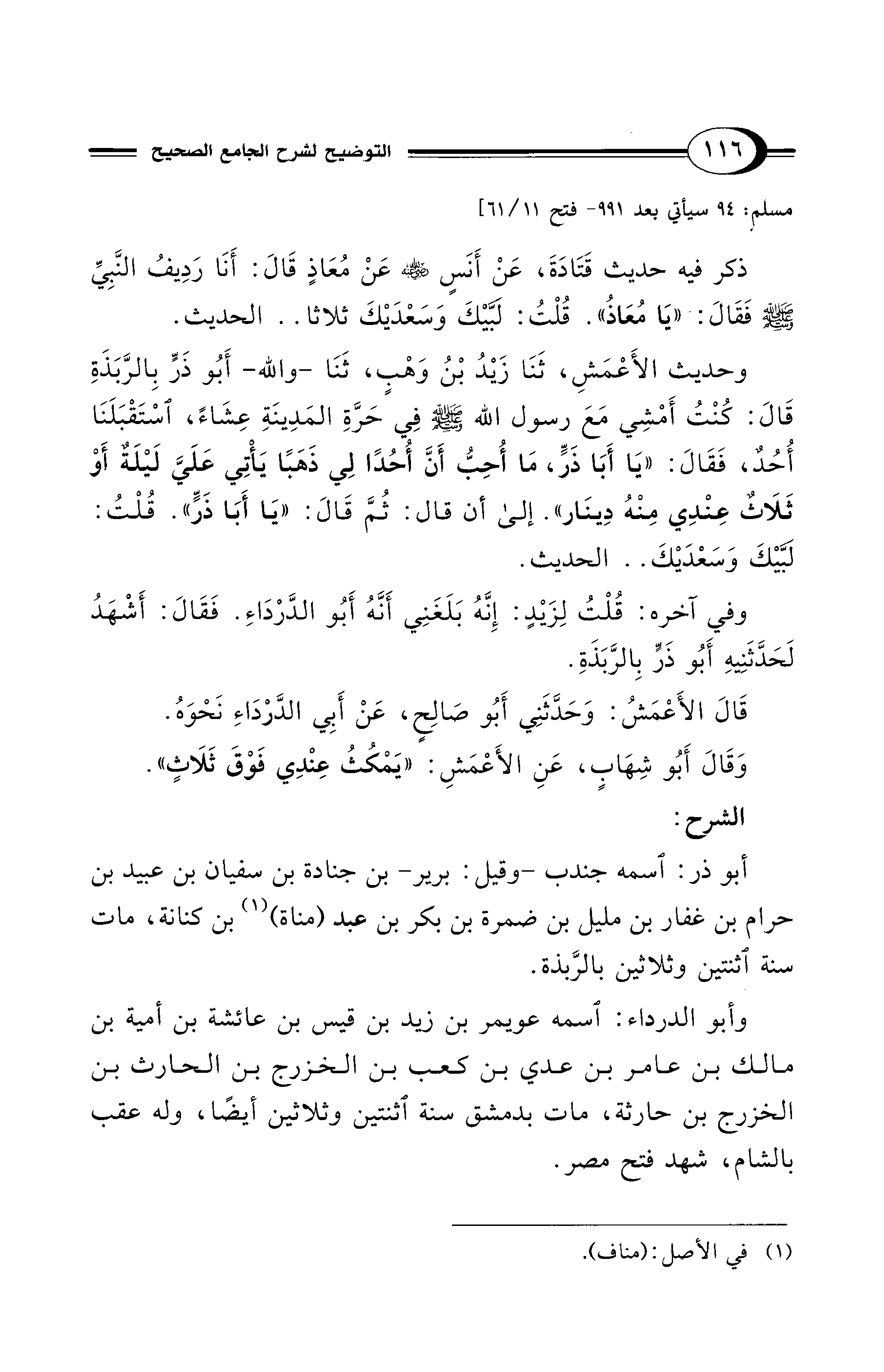 وحديث الأَعْمَشِ، ثَنَا زَيْدُ بْنُ وَهْبٍ، ثَنَا -والله- أَبُو ذَرٍّ بِالرَّبَذَةِ قَالَ: كُنْتُ أَمْشِي مَعَ رسول الله - صلى الله عليه وسلم - فِي حَرَّةِ المَدِينَةِ عِشَاءً، اسْتَقْبَلَنَا أُحُدٌ، فَقَالَ: "يَا أَبَا ذَرٍّ، مَا أُحِبُّ أَنَّ أُحُدًا لِي ذَهَبًا يَأْتِي عَلَيَّ لَيْلَةٌ أَوْ ثَلَاثٌ عِنْدِي مِنْهُ دِينَار". إلى أن قال: ثُمَّ قَالَ: "يَا أَبَا ذَرٍّ". قُلْتُ: لَبَّيْكَ وَسَعْدَيْكَ .. الحديث.