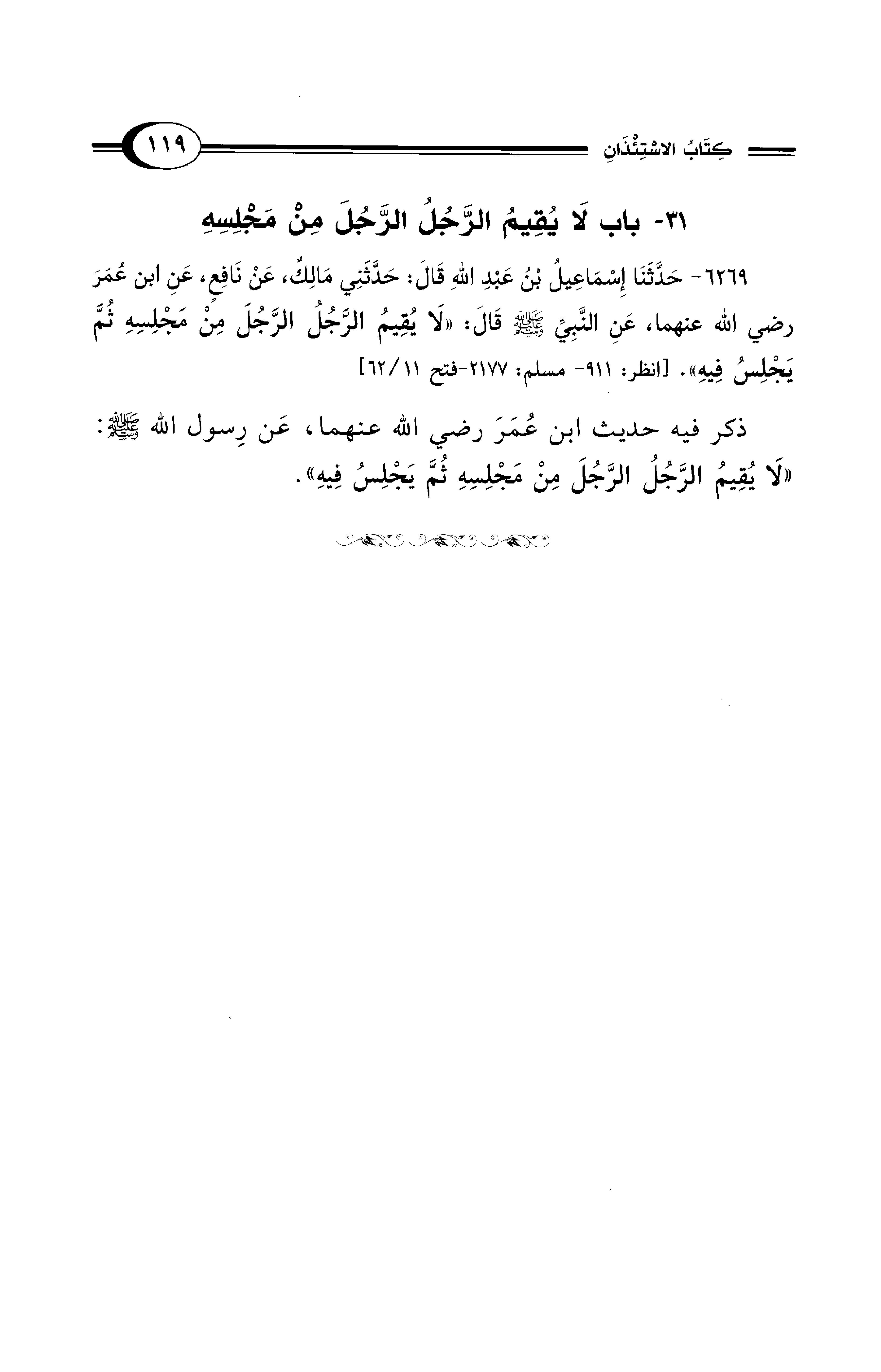 6269 - حَدَّثَنَا إِسْمَاعِيلُ بْنُ عَبْدِ اللهِ قَالَ: حَدَّثَنِي مَالِكٌ، عَنْ نَافِعٍ، عَنِ ابْنِ عُمَرَ - رضي الله عنهما -، عَنِ النَّبِيِّ - صلى الله عليه وسلم - قَالَ: «لاَ يُقِيمُ الرَّجُلُ الرَّجُلَ مِنْ مَجْلِسِهِ ثُمَّ يَجْلِسُ فِيهِ». [انظر: 911 - مسلم: 2177 - فتح 11/ 62]