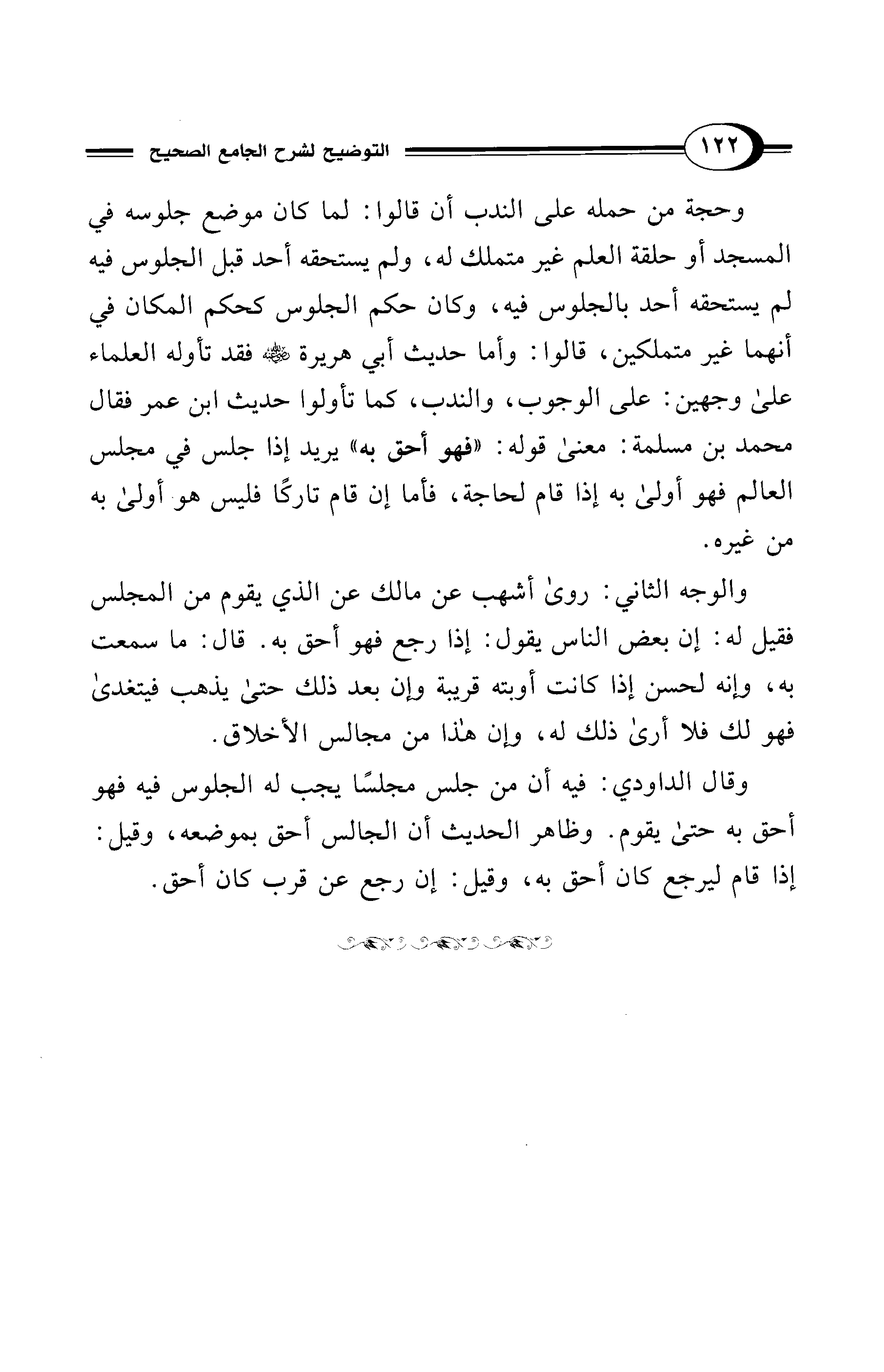 وحجة من حمله على الندب أن قالوا: لما كان موضع جلوسه في المسجد أو حلقة العلم غير متملك له، ولم يستحقه أحد قبل الجلوس فيه لم يستحقه أحد بالجلوس فيه، وكان حكم الجلوس كحكم المكان في أنهما غير متملكين، قالوا: وأما حديث أبي هريرة - رضي الله عنه - فقد تأوله العلماء على وجهين: على الوجوب، والندب، كما تأولوا حديث ابن عمر فقال محمد بن مسلمة: معنى قوله: "فهو أحق به" يريد إذا جلس في مجلس العالم فهو أولى به إذا قام لحاجة، فأما إن قام تاركًا فليس هو أولى به من غيره.