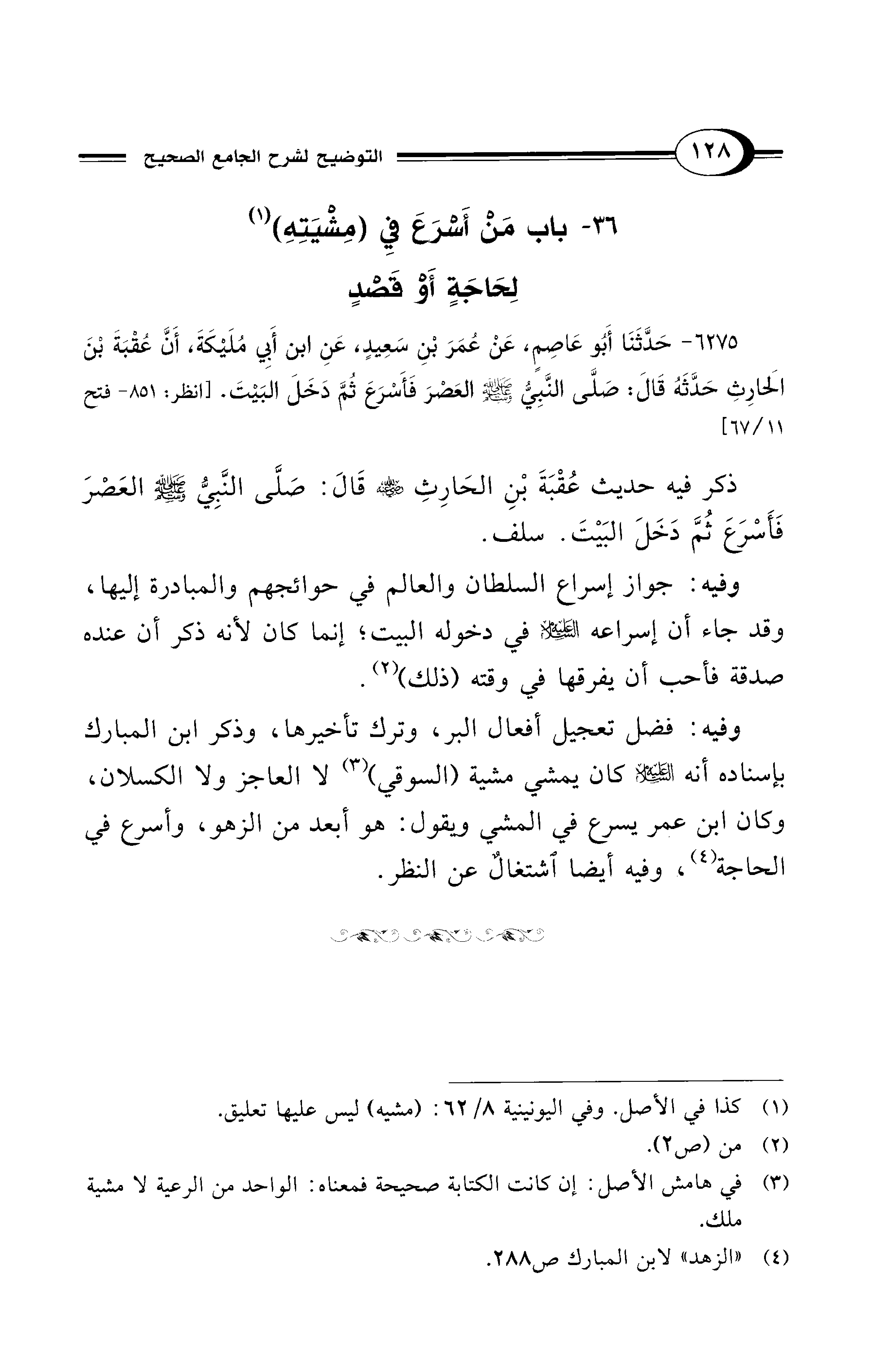 36 - باب مَنْ أَسْرَعَ فِي (مِشْيَتِهِ) (¬1) لِحَاجَةٍ أَوْ قَصْدٍ