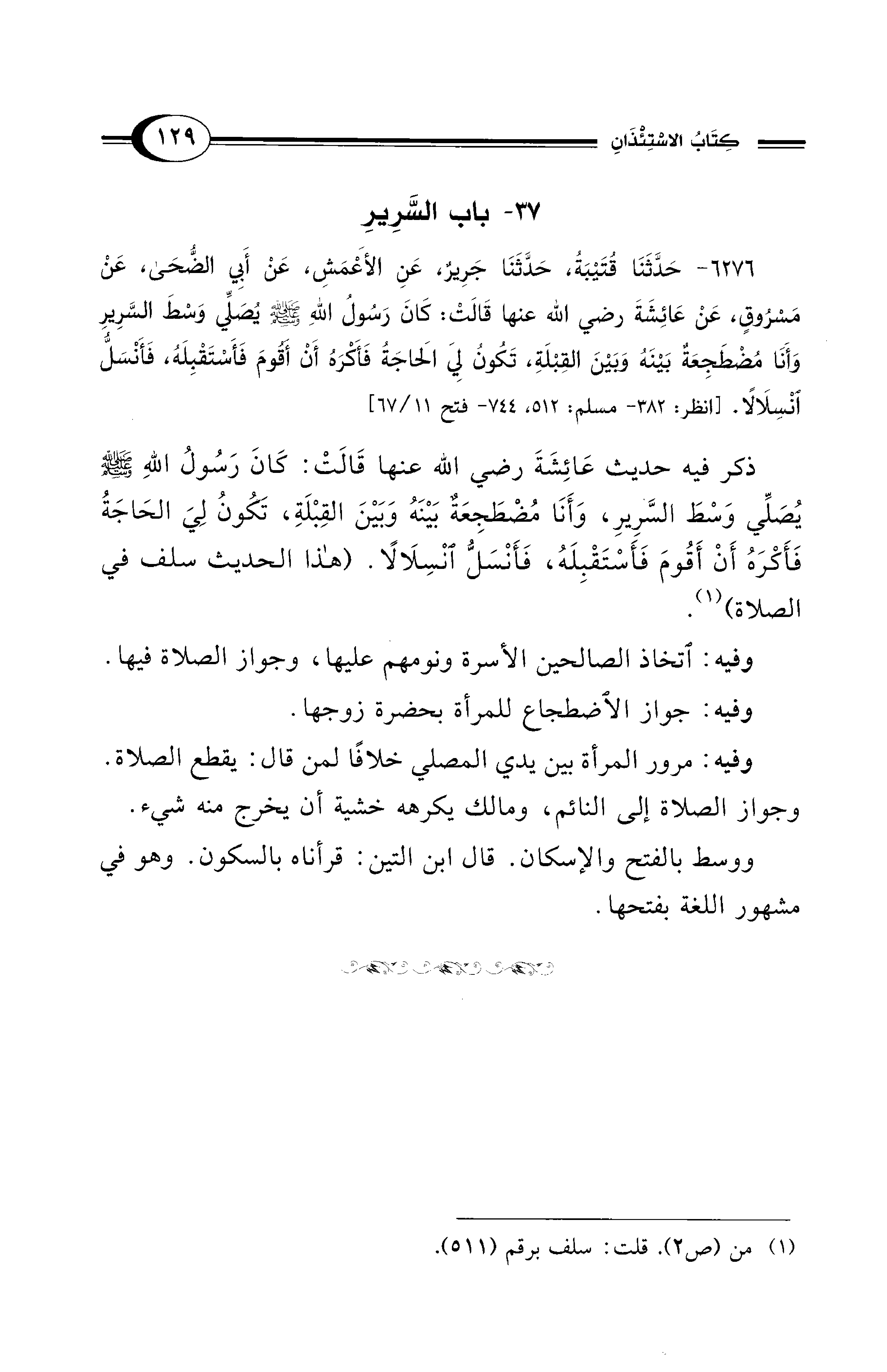6276 - حَدَّثَنَا قُتَيْبَةُ، حَدَّثَنَا جَرِيرٌ، عَنِ الأَعْمَشِ، عَنْ أَبِي الضُّحَى، عَنْ مَسْرُوقٍ، عَنْ عَائِشَةَ - رضي الله عنها - قَالَتْ: كَانَ رَسُولُ اللهِ - صلى الله عليه وسلم - يُصَلِّي وَسْطَ السَّرِيرِ وَأَنَا مُضْطَجِعَةٌ بَيْنَهُ وَبَيْنَ الْقِبْلَةِ، تَكُونُ لِىَ الْحَاجَةُ فَأَكْرَهُ أَنْ أَقُومَ فَأَسْتَقْبِلَهُ، فَأَنْسَلُّ انْسِلاَلاً. [انظر: 382 - مسلم: 512، 744 - فتح 11/ 67]