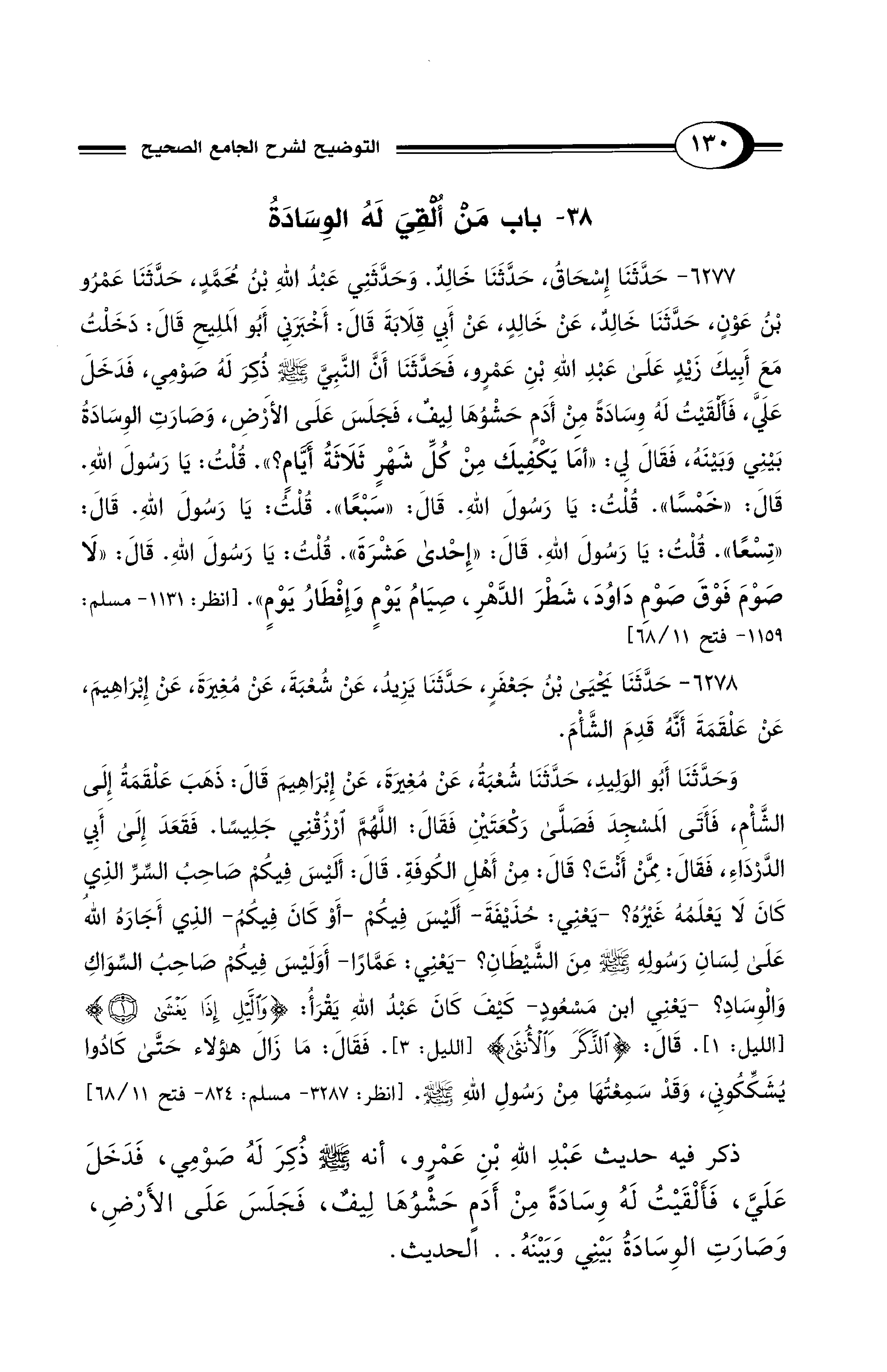 6277 - حَدَّثَنَا إِسْحَاقُ، حَدَّثَنَا خَالِدٌ. وَحَدَّثَنِي عَبْدُ اللهِ بْنُ مُحَمَّدٍ، حَدَّثَنَا عَمْرُو بْنُ عَوْنٍ، حَدَّثَنَا خَالِدٌ، عَنْ خَالِدٍ، عَنْ أَبِي قِلاَبَةَ قَالَ: أَخْبَرَنِي أَبُو الْمَلِيحِ قَالَ: دَخَلْتُ مَعَ أَبِيكَ زَيْدٍ عَلَى عَبْدِ اللهِ بْنِ عَمْرٍو، فَحَدَّثَنَا أَنَّ النَّبِيَّ - صلى الله عليه وسلم - ذُكِرَ لَهُ صَوْمِي، فَدَخَلَ عَلَيَّ، فَأَلْقَيْتُ لَهُ وِسَادَةً مِنْ أَدَمٍ حَشْوُهَا لِيفٌ، فَجَلَسَ عَلَى الأَرْضِ، وَصَارَتِ الْوِسَادَةُ بَيْنِي وَبَيْنَهُ، فَقَالَ لِي: «أَمَا يَكْفِيكَ مِنْ كُلِّ شَهْرٍ ثَلاَثَةُ أَيَّامٍ؟». قُلْتُ: يَا رَسُولَ اللهِ. قَالَ: «خَمْسًا». قُلْتُ: يَا رَسُولَ اللهِ. قَالَ: «سَبْعًا». قُلْتُ: يَا رَسُولَ اللهِ. قَالَ: «تِسْعًا». قُلْتُ: يَا رَسُولَ اللهِ. قَالَ: «إِحْدَى عَشْرَةَ». قُلْتُ: يَا رَسُولَ اللهِ. قَالَ: «لاَ صَوْمَ فَوْقَ صَوْمِ دَاوُدَ، شَطْرَ الدَّهْرِ، صِيَامُ يَوْمٍ وَإِفْطَارُ يَوْمٍ». [انظر: 1131 - مسلم: