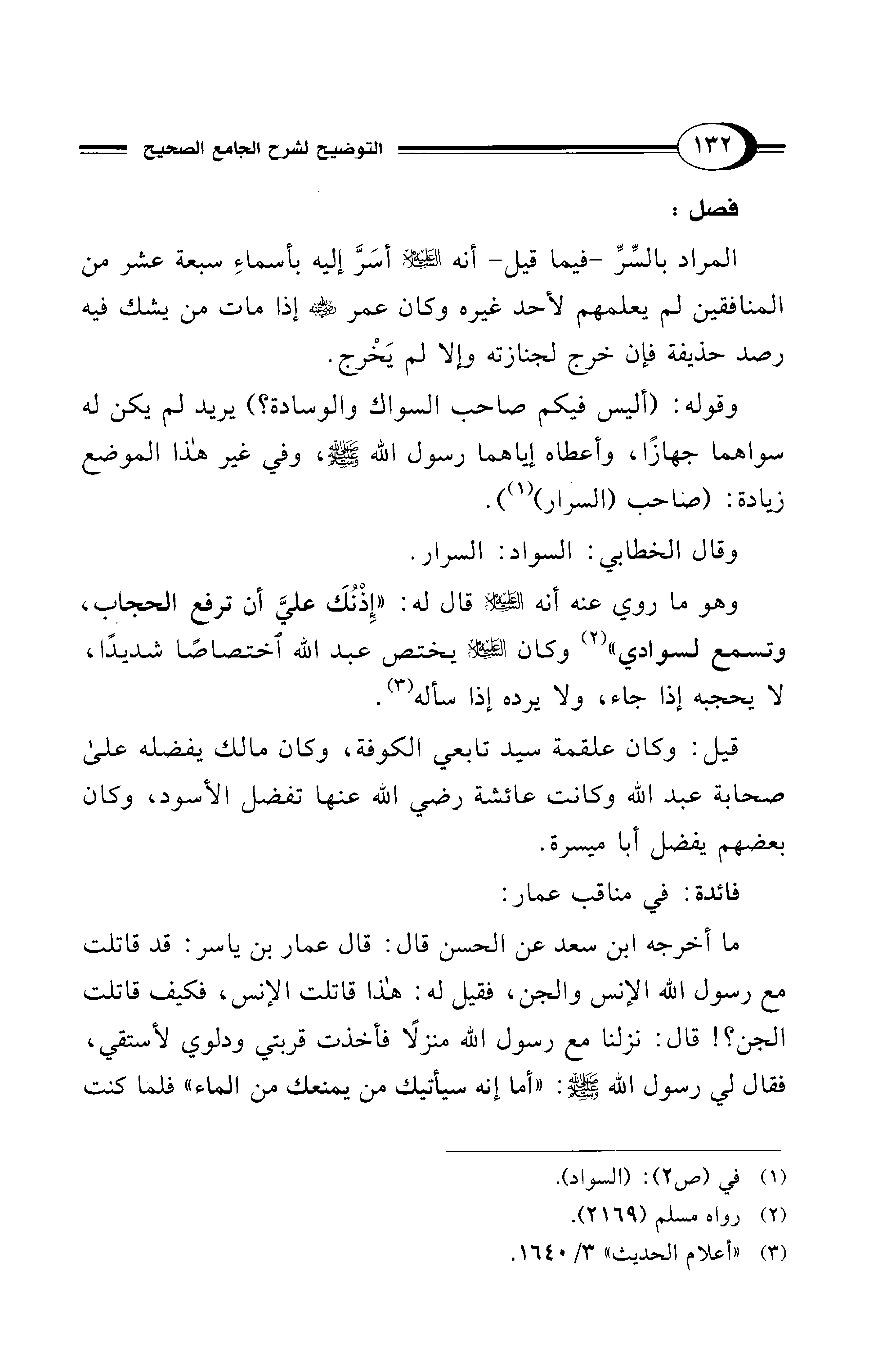 المراد بالسِّرِّ -فيما قيل- أنه - عليه السلام - أسَرَّ إليه بأسماءِ سبعة عشر من المنافقين لم يعلمهم لأحد غيره وكان عمر - رضي الله عنه - إذا مات من يشك فيه رصد حذيفة فإن خرج لجنازته وإلا لم يَخْرج.