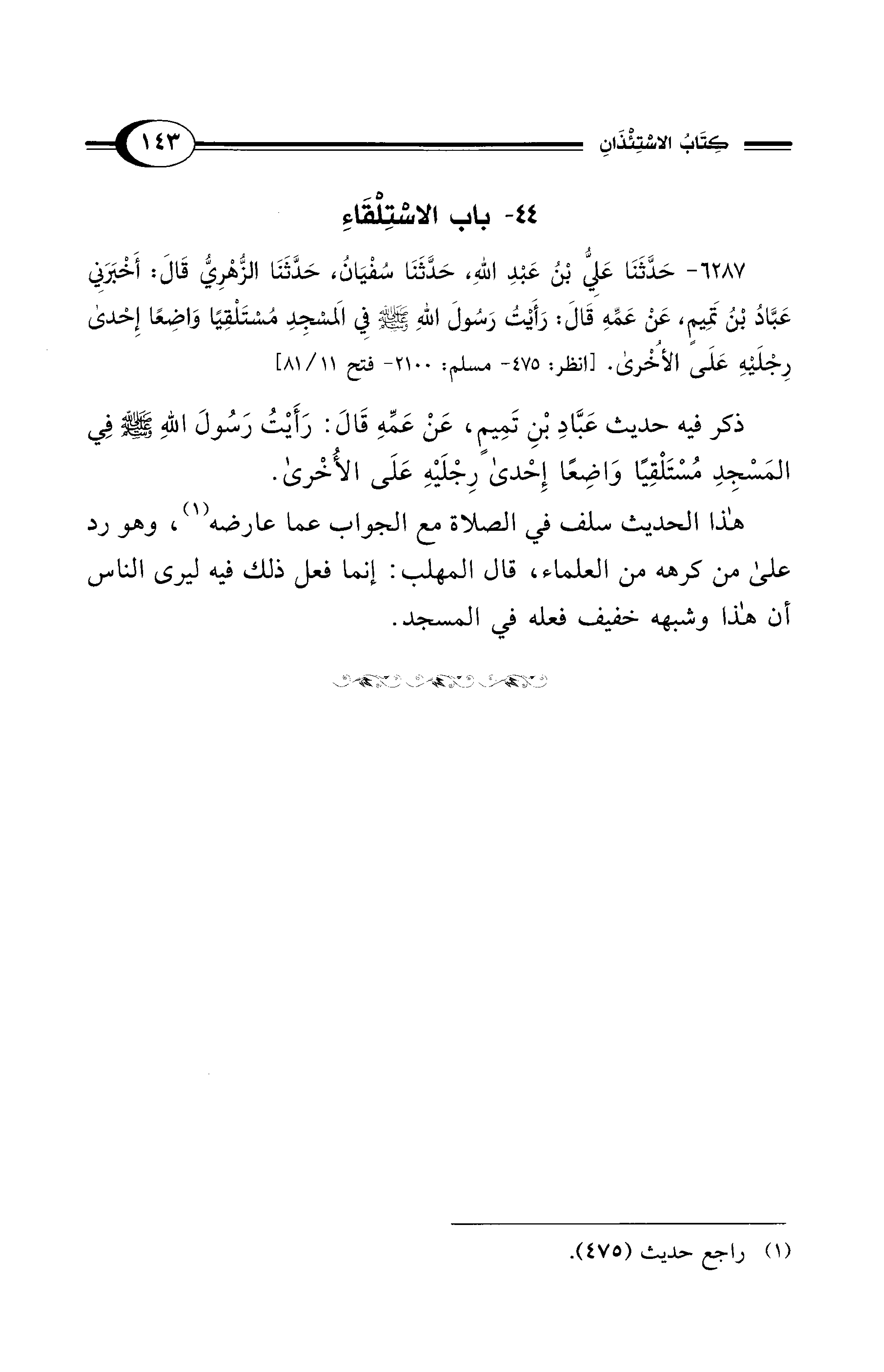 ذكر فيه حديث عَبَّادِ بْنِ تَمِيمٍ، عَنْ عَمِّهِ قَالَ: رَأَيْتُ رَسُولَ اللهِ - صلى الله عليه وسلم - فِي المَسْجِدِ مُسْتَلْقِيًا وَاضِعًا إِحْدى رِجْلَيْهِ عَلَى الأُخْرى.