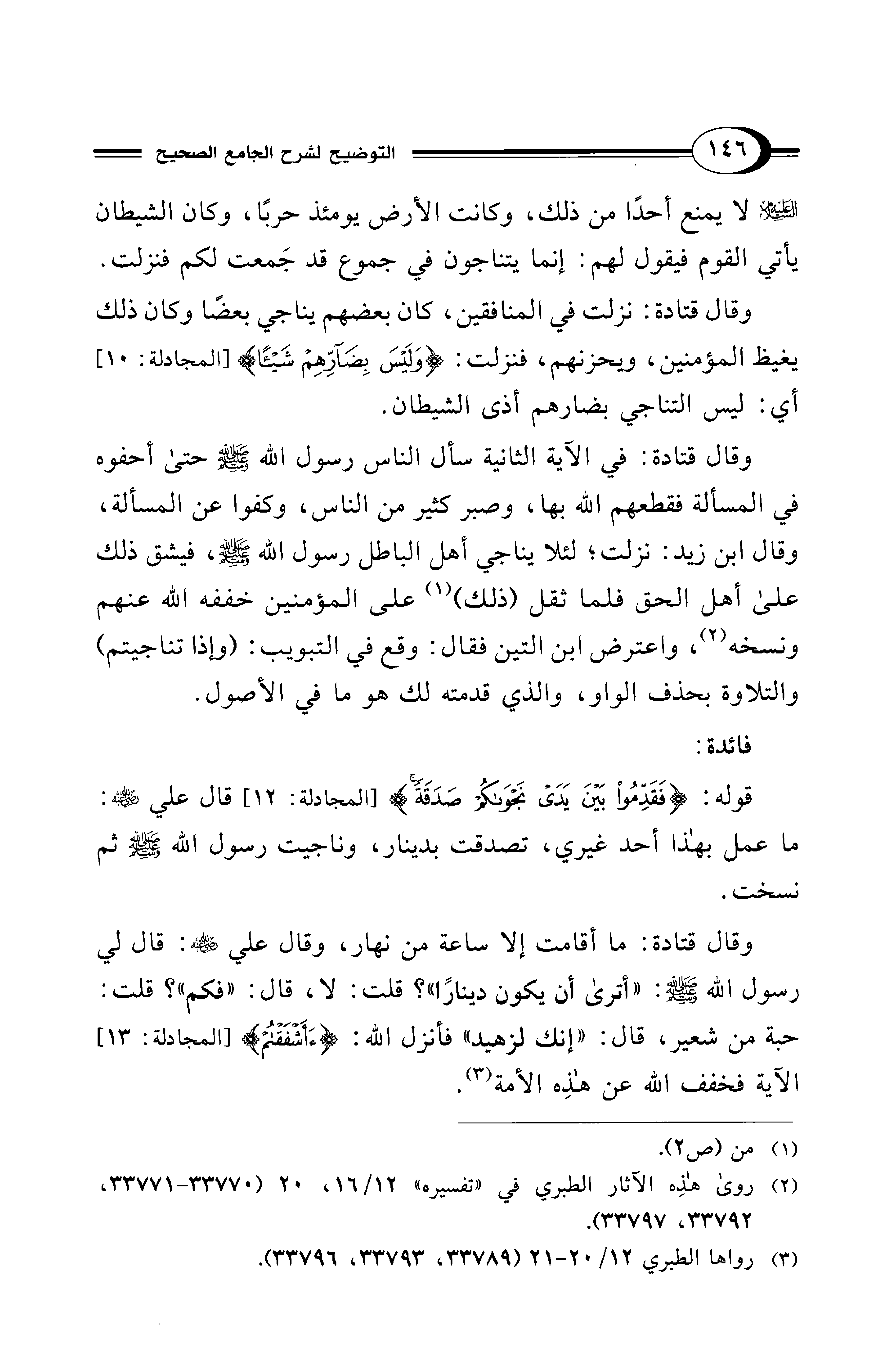 وقال قتادة: في الآية الثانية سأل الناس رسول الله - صلى الله عليه وسلم - حتى أحفوه في المسألة فقطعهم الله بها، وصبر كثير من الناس، وكفوا عن المسألة، وقال ابن زيد: نزلت؛ لئلا يناجي أهل الباطل رسول الله - صلى الله عليه وسلم -، فيشق ذلك على أهل الحق فلما ثقل (ذلك) (¬1) على المؤمنين خففه الله عنهم ونسخه (¬2)، واعترض ابن التين فقال: وقع في التبويب: (وإذا تناجيتم) والتلاوة بحذف الواو، والذي قدمته لك هو ما في الأصول.