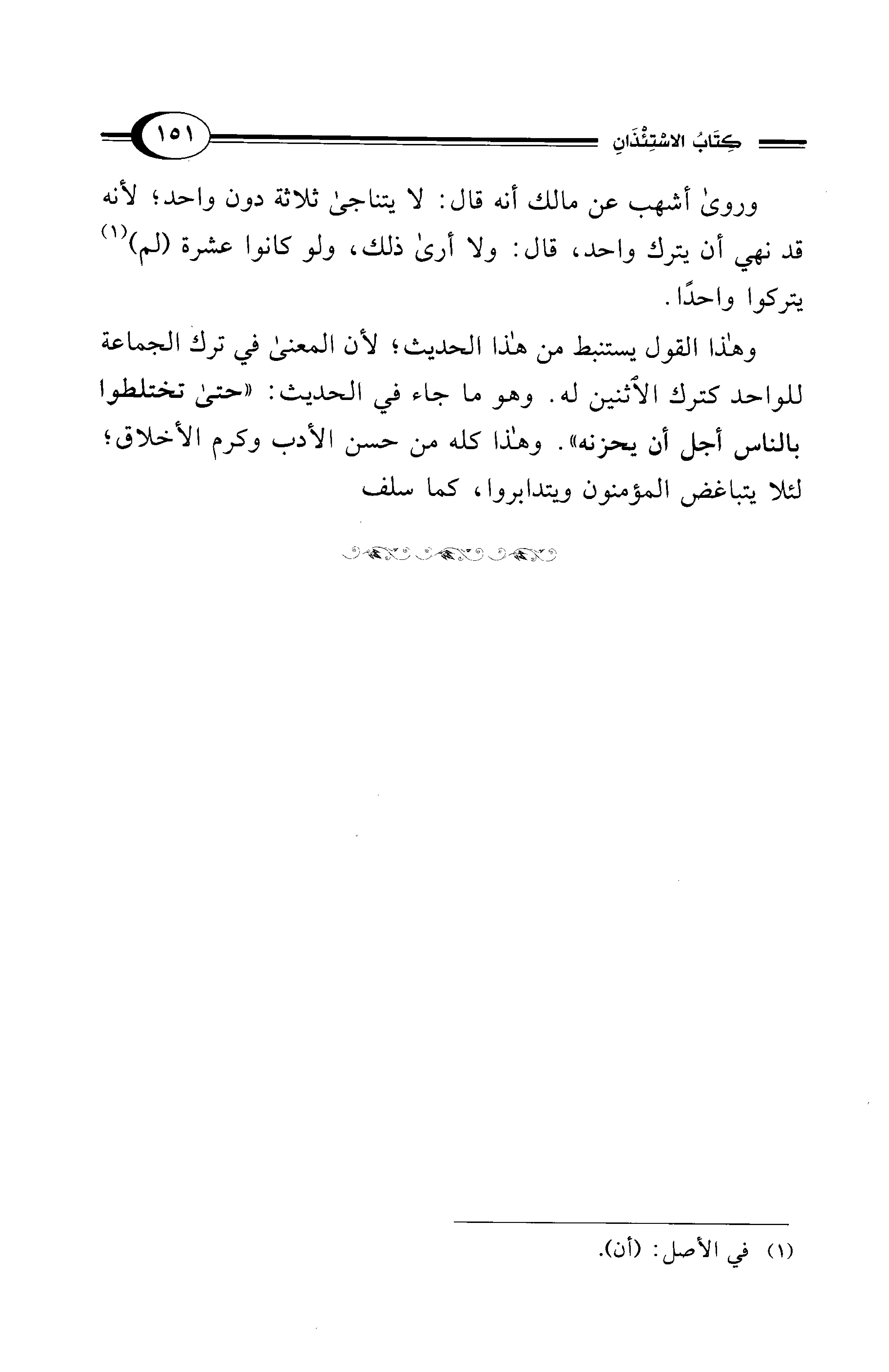 وهذا القول يستنبط من هذا الحديث؛ لأن المعنى في ترك الجماعة للواحد كترك الاثنين له. وهو ما جاء في الحديث: "حتى تختلطوا بالناس أجل أن يحزنه". وهذا كله من حسن الأدب وكرم الأخلاق؛ لئلا يتباغض المؤمنون ويتدابروا، كما سلف