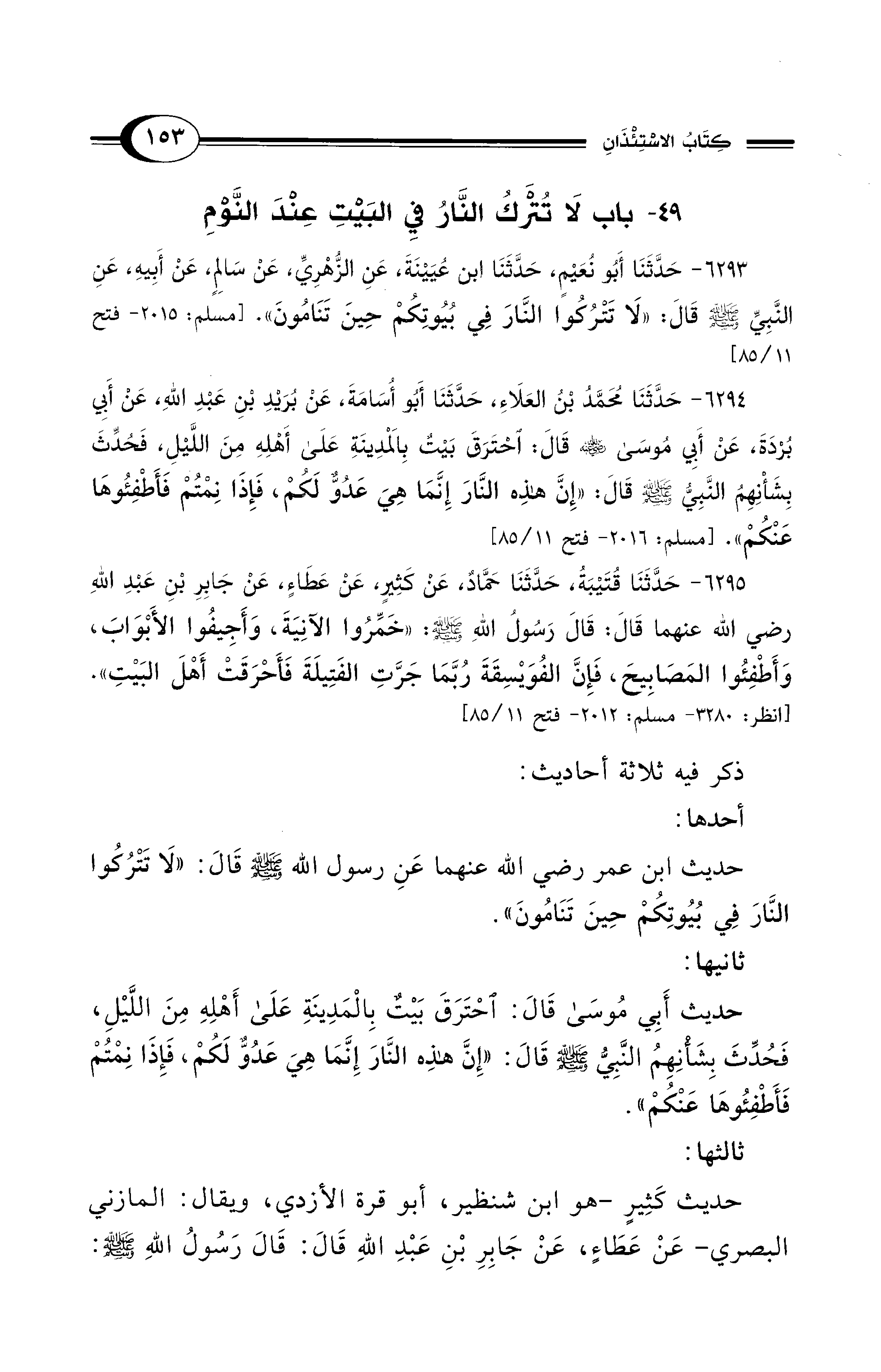 6293 - حَدَّثَنَا أَبُو نُعَيْمٍ، حَدَّثَنَا ابْنُ عُيَيْنَةَ، عَنِ الزُّهْرِيِّ، عَنْ سَالِمٍ، عَنْ أَبِيهِ، عَنِ النَّبِيِّ - صلى الله عليه وسلم - قَالَ: «لاَ تَتْرُكُوا النَّارَ فِي بُيُوتِكُمْ حِينَ تَنَامُونَ». [مسلم: 2015 - فتح 11/ 85]