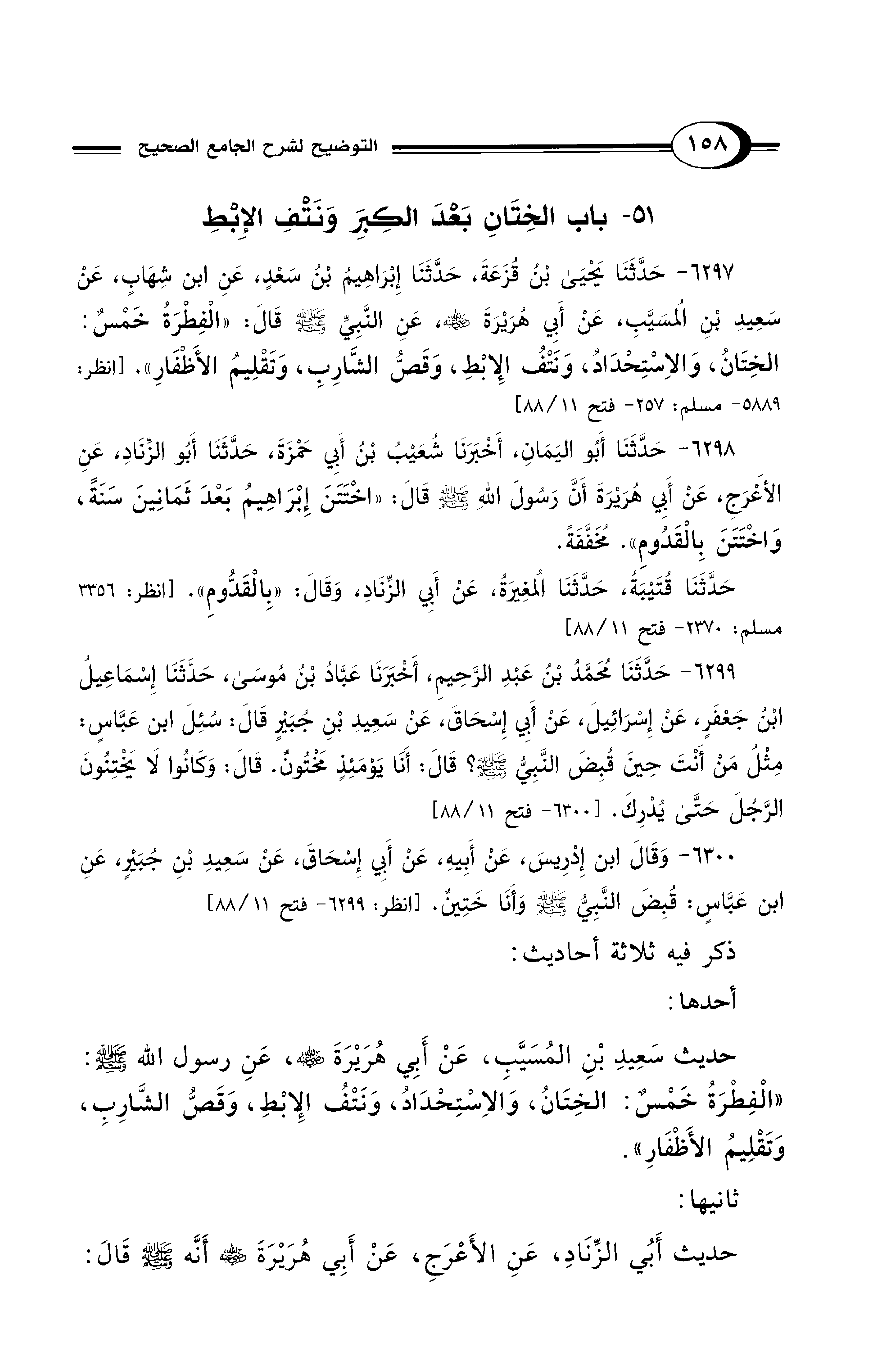 6297 - حَدَّثَنَا يَحْيَى بْنُ قُزَعَةَ، حَدَّثَنَا إِبْرَاهِيمُ بْنُ سَعْدٍ، عَنِ ابْنِ شِهَابٍ، عَنْ سَعِيدِ بْنِ الْمُسَيَّبِ، عَنْ أَبِي هُرَيْرَةَ - رضي الله عنه -، عَنِ النَّبِيِّ - صلى الله عليه وسلم - قَالَ: «الْفِطْرَةُ خَمْسٌ: الْخِتَانُ، وَالاِسْتِحْدَادُ، وَنَتْفُ الإِبْطِ، وَقَصُّ الشَّارِبِ، وَتَقْلِيمُ الأَظْفَارِ». [انظر: 5889 - مسلم: 257 - فتح 11/ 88]