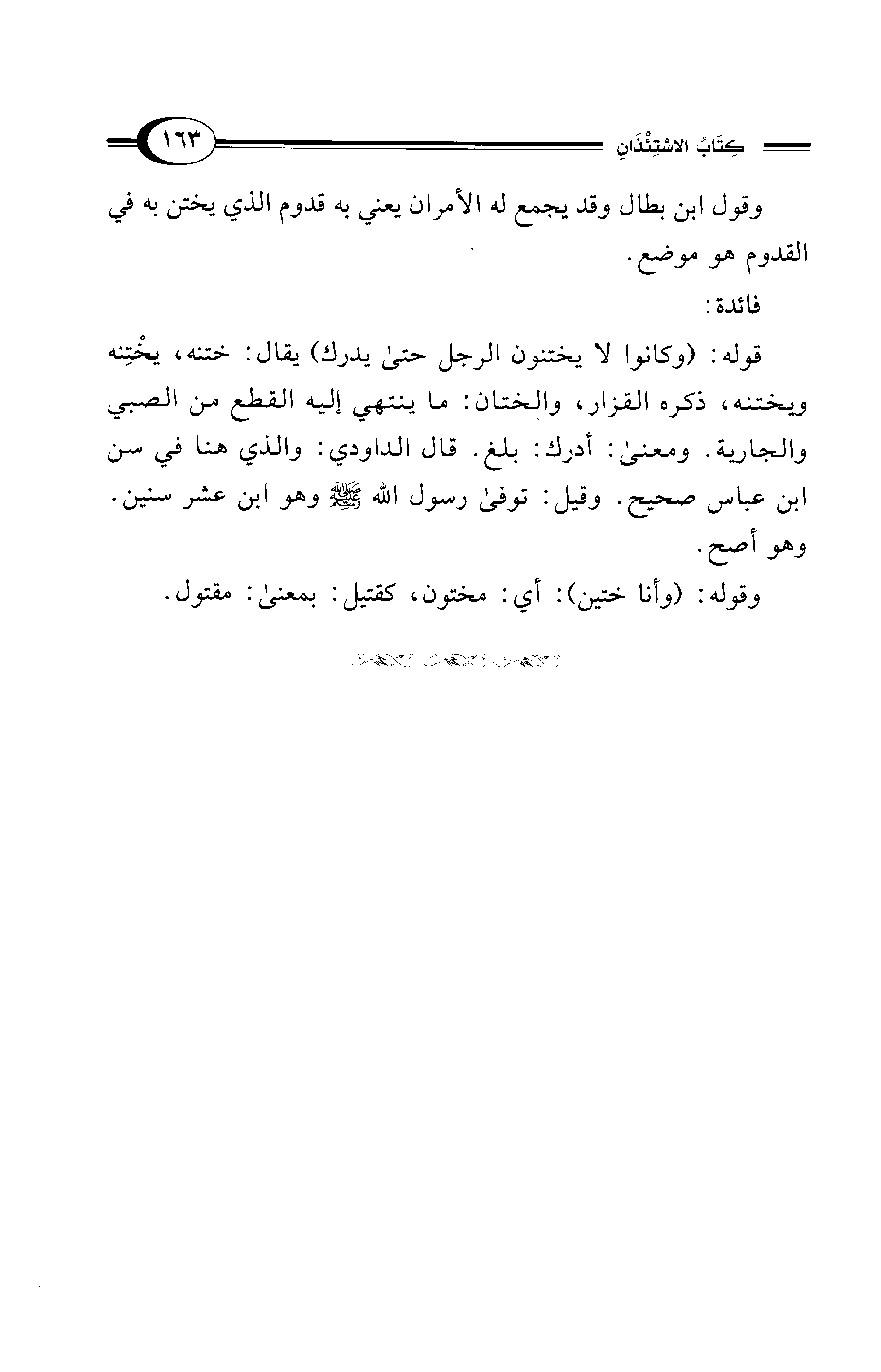 قوله: (وكانوا لا يختنون الرجل حتى يدرك) يقال: ختنه، يخْتِنه ويختنه، ذكره القزار، والختان: ما ينتهي إليه القطع من الصبي والجارية. ومعنى: أدرك: بلغ. قال الداودي: والذي هنا في سن ابن عباس صحيح. وقيل: توفي رسول الله - صلى الله عليه وسلم -وهو ابن عشر سنين. وهو أصح.