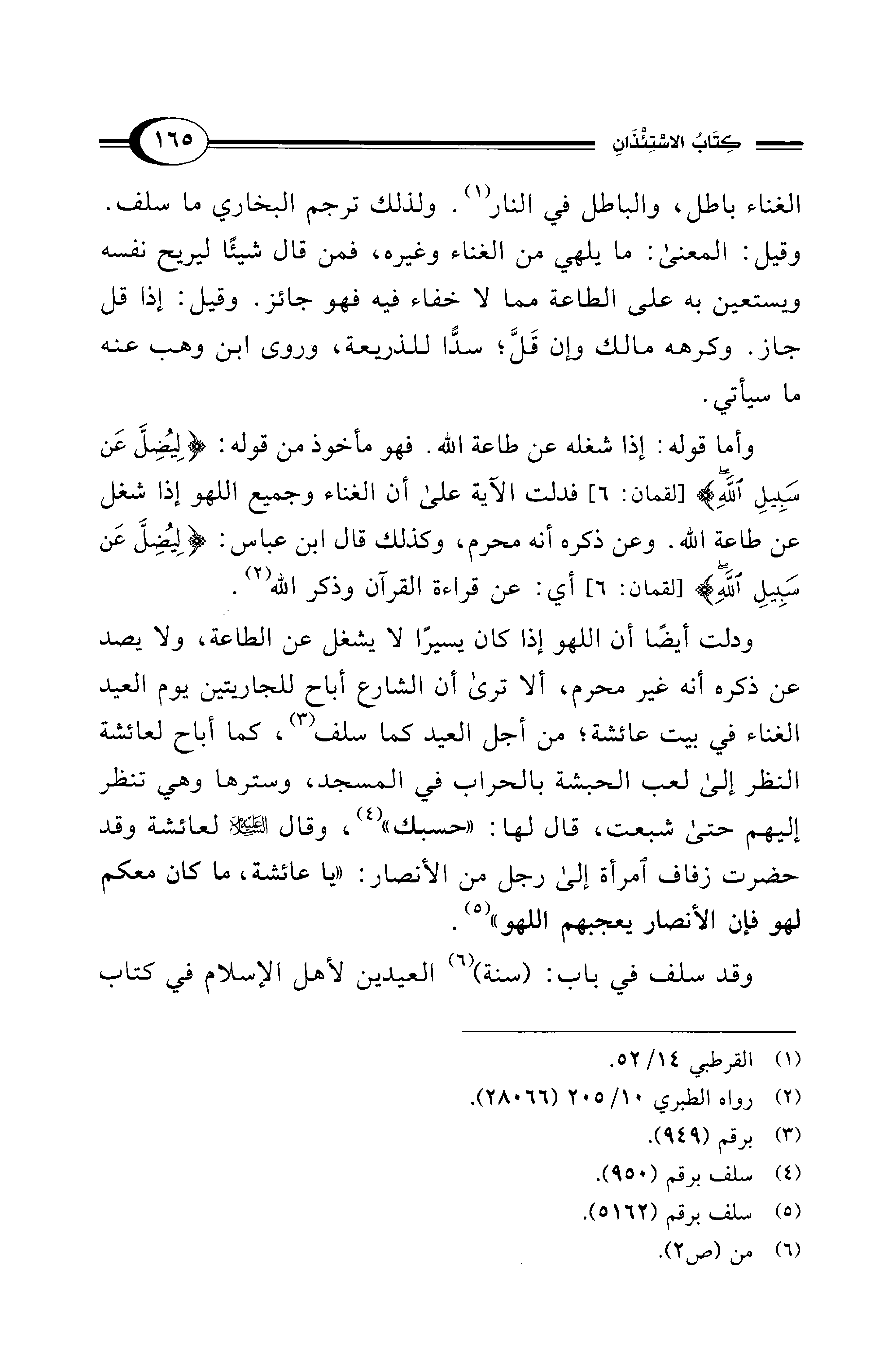 وأما قوله: إذا شغله عن طاعة الله. فهو مأخوذ من قوله: {لِيُضِلَّ عَنْ سَبِيلِ اللهِ} [لقمان: 6] فدلت الآية على أن الغناء وجميع اللهو إذا شغل عن طاعة الله. وعن ذكره أنه محرم، وكذلك قال ابن عباس: {لِيُضِلَّ عَنْ سَبِيلِ اللهِ} [لقمان: 6] أي: عن قراءة القرآن وذكر الله (¬2).