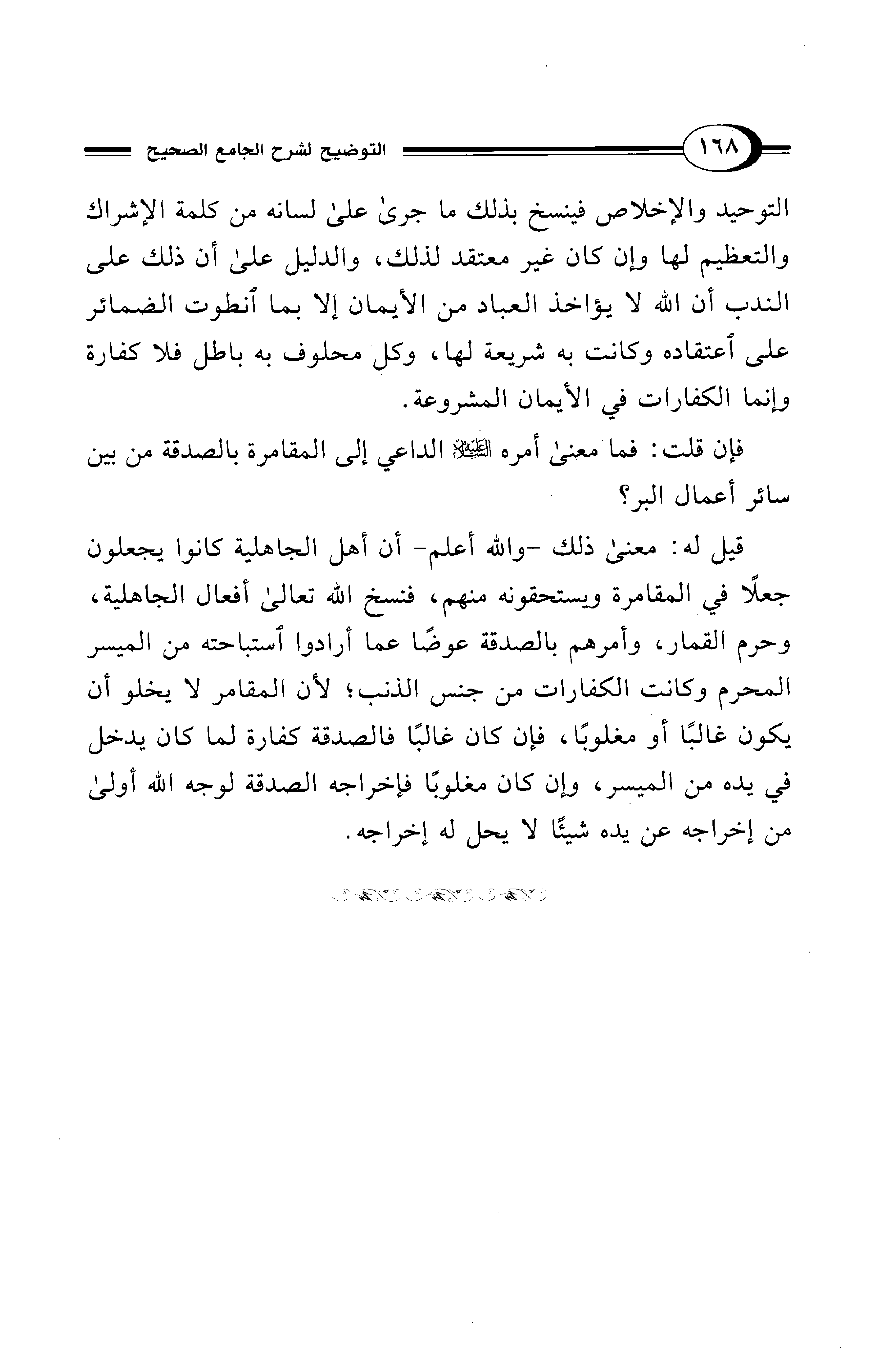 قيل له: معنى ذلك -والله أعلم- أن أهل الجاهلية كانوا يجعلون جعلًا في المقامرة ويستحقونه منهم، فنسخ الله تعالى أفعال الجاهلية، وحرم القمار، وأمرهم بالصدقة عوضًا عما أرادوا استباحته من الميسر المحرم وكانت الكفارات من جنس الذنب؛ لأن المقامر لا يخلو أن يكون غالبًا أو مغلوبًا، فإن كان غالبًا فالصدقة كفارة لما كان يدخل في يده من الميسر، وإن كان مغلوبًا فإخراجه الصدقة لوجه الله أولى من إخراجه عن يده شيئًا لا يحل له إخراجه.