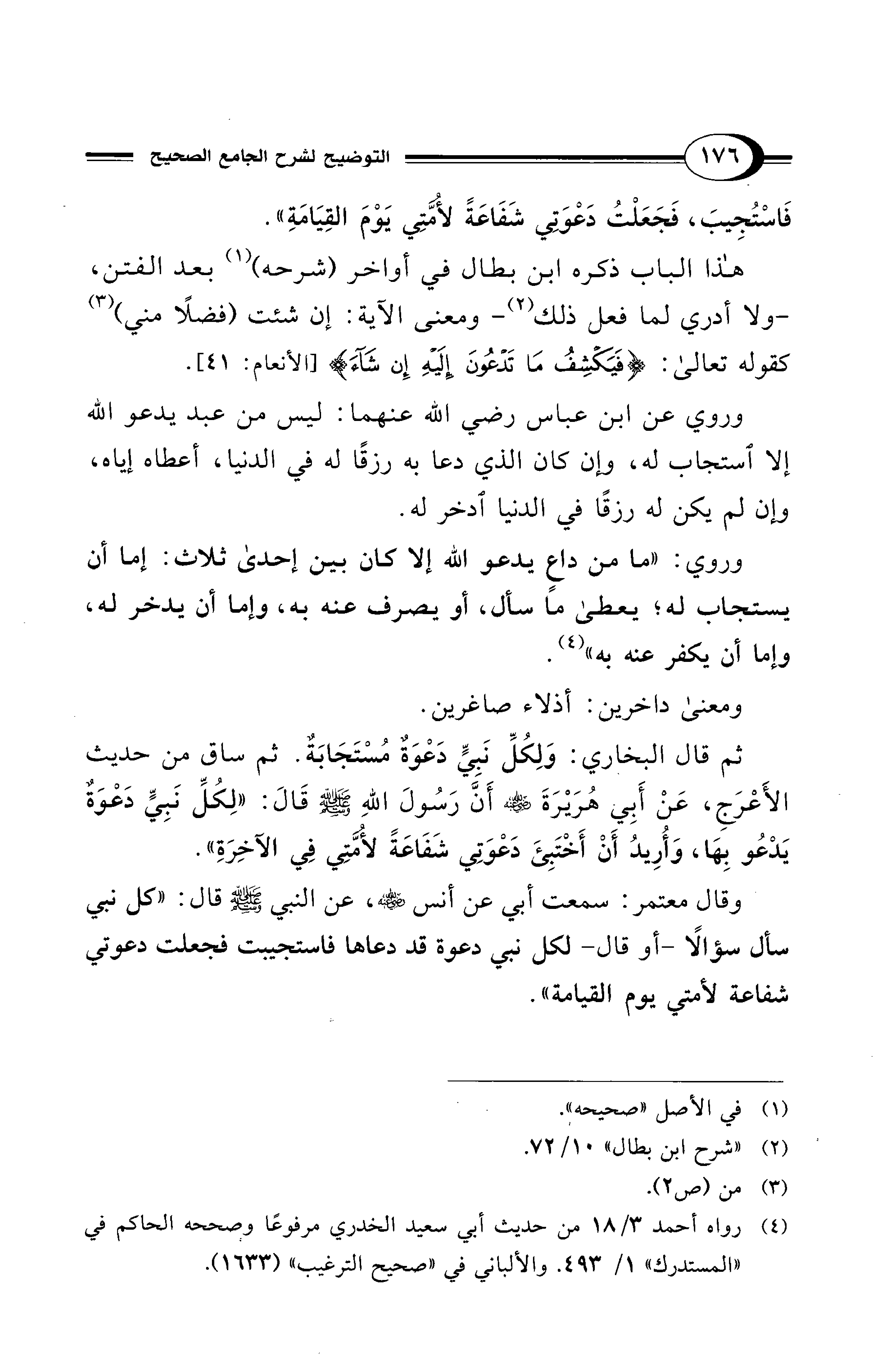 ثم قال البخاري: وَلِكُلِّ نَبِيٍّ دَعْوَةٌ مُسْتَجَابَةٌ. ثم ساق من حديث الأَعْرَجِ، عَنْ أَبِي هُرَيْرَةَ - رضي الله عنه - أَنَّ رَسُولَ اللهِ - صلى الله عليه وسلم - قَالَ: "لِكُلِّ نَبِيٍّ دَعْوَةٌ يَدْعُو بِهَا، وَأُرِيدُ أَنْ أَخْتَبِئَ دَعْوَتِي شَفَاعَةً لأُمَّتِي فِي الآخِرَةِ".