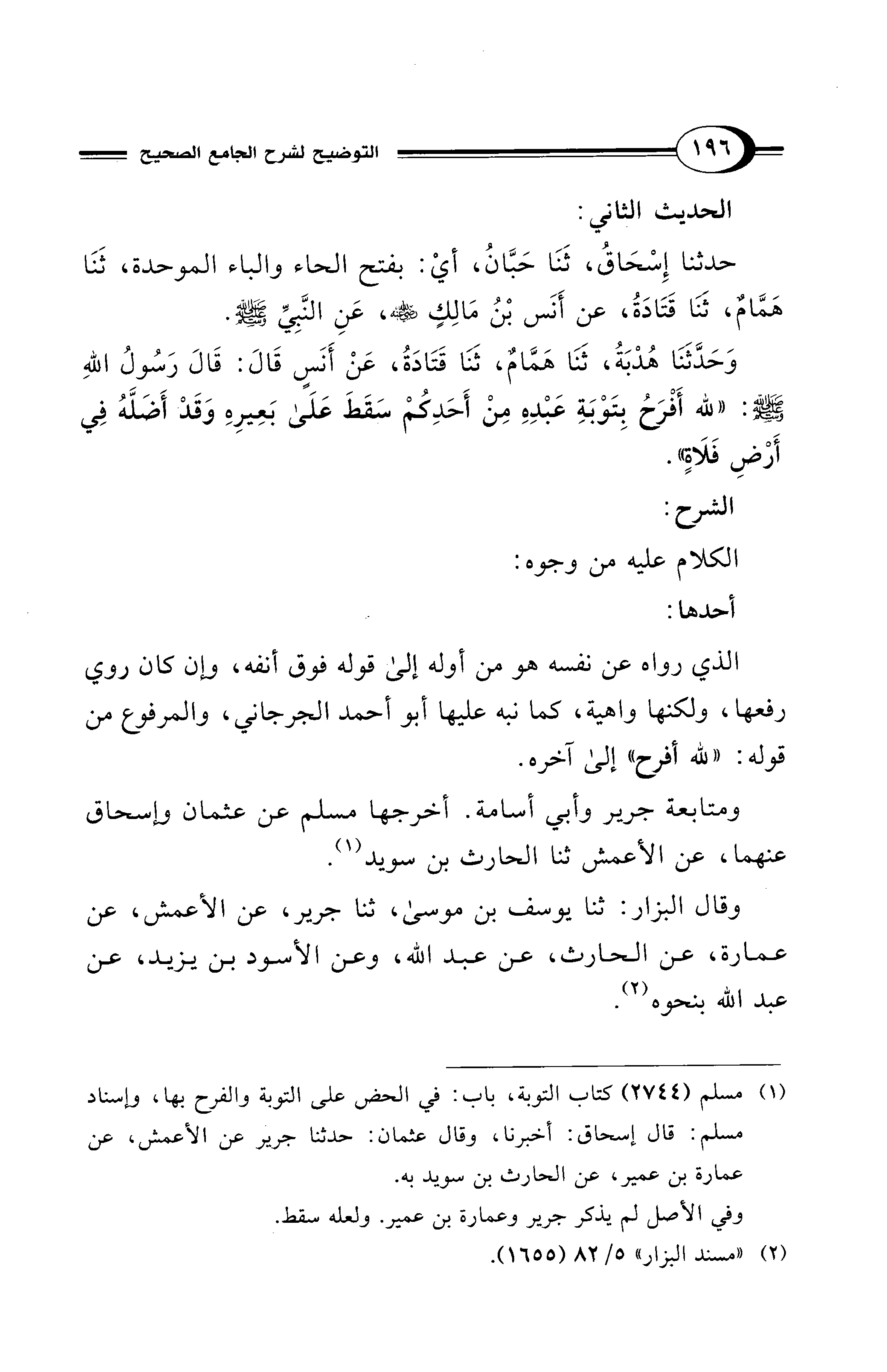 (¬1) مسلم (2744) كتاب التوبة، باب: في الحض على التوبة والفرح بها، وإسناد مسلم: قال إسحاق: أخبرنا، وقال عثمان: حدثنا جرير عن الأعمش، عن عمارة بن عمير، عن الحارث بن سويد به.