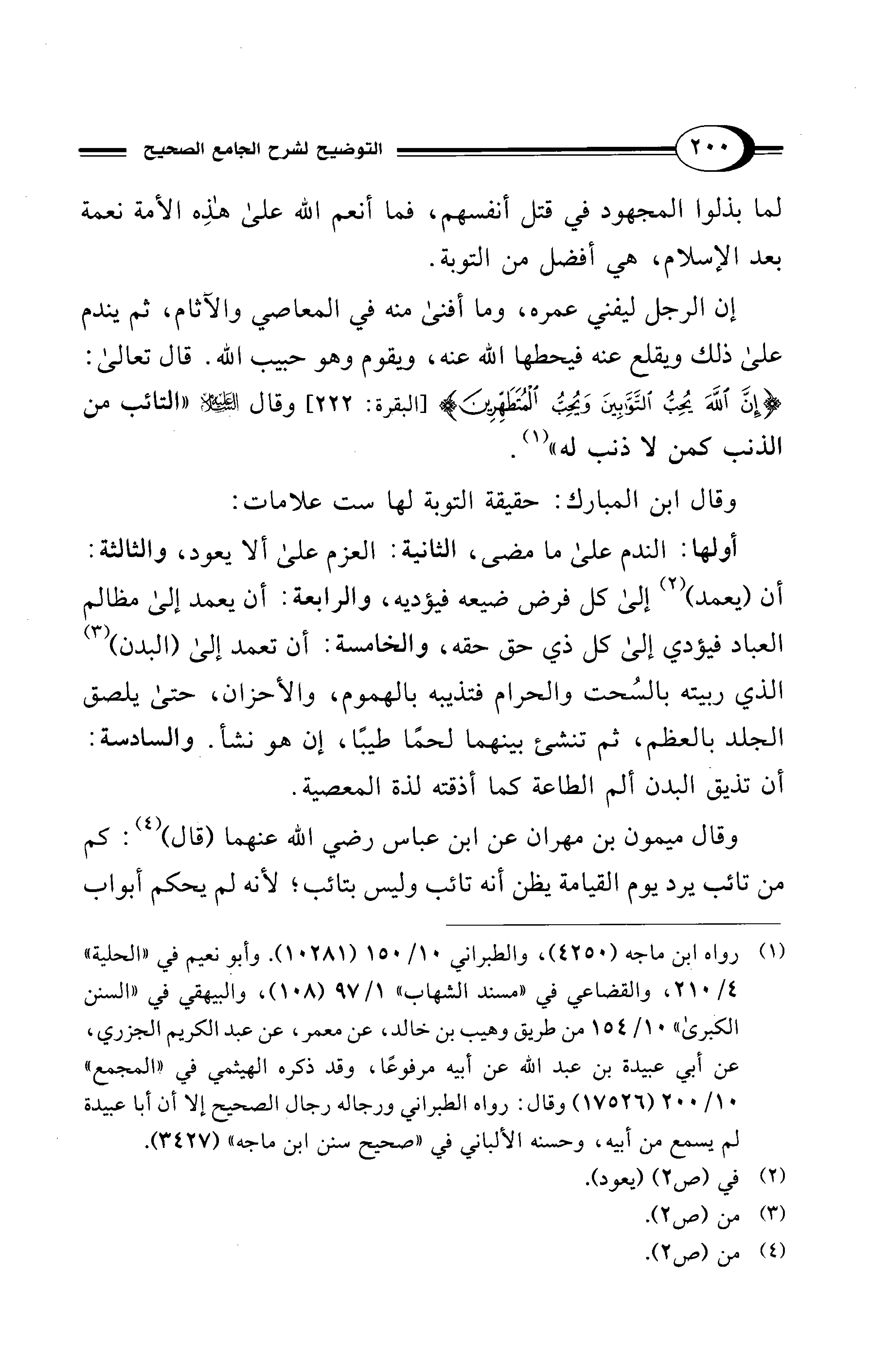وقال ميمون بن مهران عن ابن عباس - رضي الله عنهما - (قال) (¬4): كم من تائب يرد يوم القيامة يظن أنه تائب وليس بتائب؛ لأنه لم يحكم أبواب