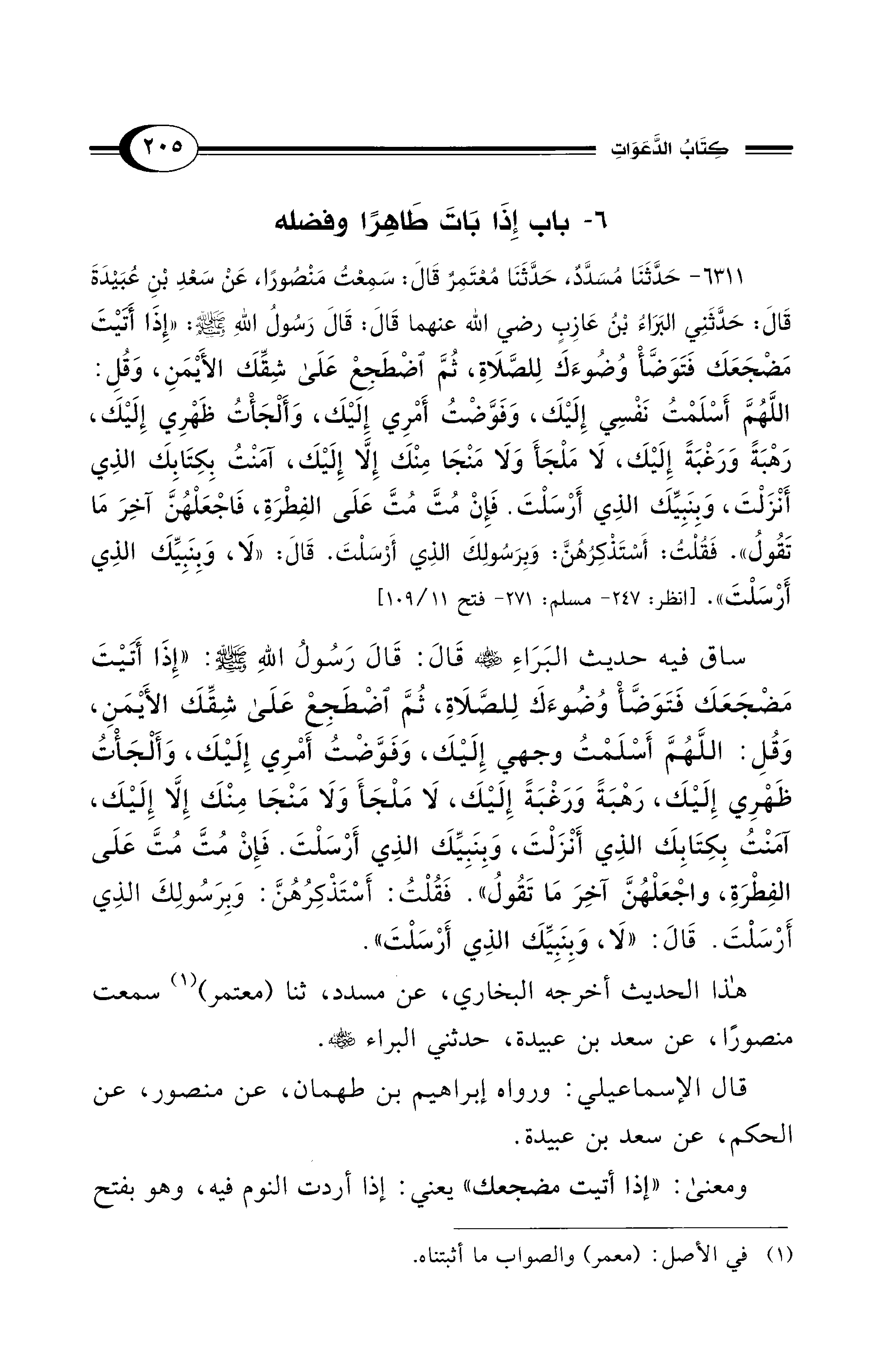 6311 - حَدَّثَنَا مُسَدَّدٌ، حَدَّثَنَا مُعْتَمِرٌ قَالَ: سَمِعْتُ مَنْصُورًا، عَنْ سَعْدِ بْنِ عُبَيْدَةَ قَالَ: حَدَّثَنِي الْبَرَاءُ بْنُ عَازِبٍ - رضي الله عنهما - قَالَ: قَالَ رَسُولُ اللهِ - صلى الله عليه وسلم -: «إِذَا أَتَيْتَ مَضْجَعَكَ فَتَوَضَّأْ وَضُوءَكَ لِلصَّلاَةِ، ثُمَّ اضْطَجِعْ عَلَى شِقِّكَ الأَيْمَنِ، وَقُلِ: اللَّهُمَّ أَسْلَمْتُ نَفْسِي إِلَيْكَ، وَفَوَّضْتُ أَمْرِي إِلَيْكَ، وَأَلْجَأْتُ ظَهْرِى إِلَيْكَ، رَهْبَةً وَرَغْبَةً إِلَيْكَ، لاَ مَلْجَأَ وَلاَ مَنْجَا مِنْكَ إِلاَّ إِلَيْكَ، آمَنْتُ بِكِتَابِكَ الَّذِي أَنْزَلْتَ، وَبِنَبِيِّكَ الَّذِي أَرْسَلْتَ. فَإِنْ مُتَّ مُتَّ عَلَى الْفِطْرَةِ، فَاجْعَلْهُنَّ آخِرَ مَا تَقُولُ». فَقُلْتُ: أَسْتَذْكِرُهُنَّ: وَبِرَسُولِكَ الَّذِي أَرْسَلْتَ. قَالَ: «لاَ، وَبِنَبِيِّكَ الَّذِي أَرْسَلْتَ». [انظر: 247 - مسلم: 271 - فتح 11/ 109]