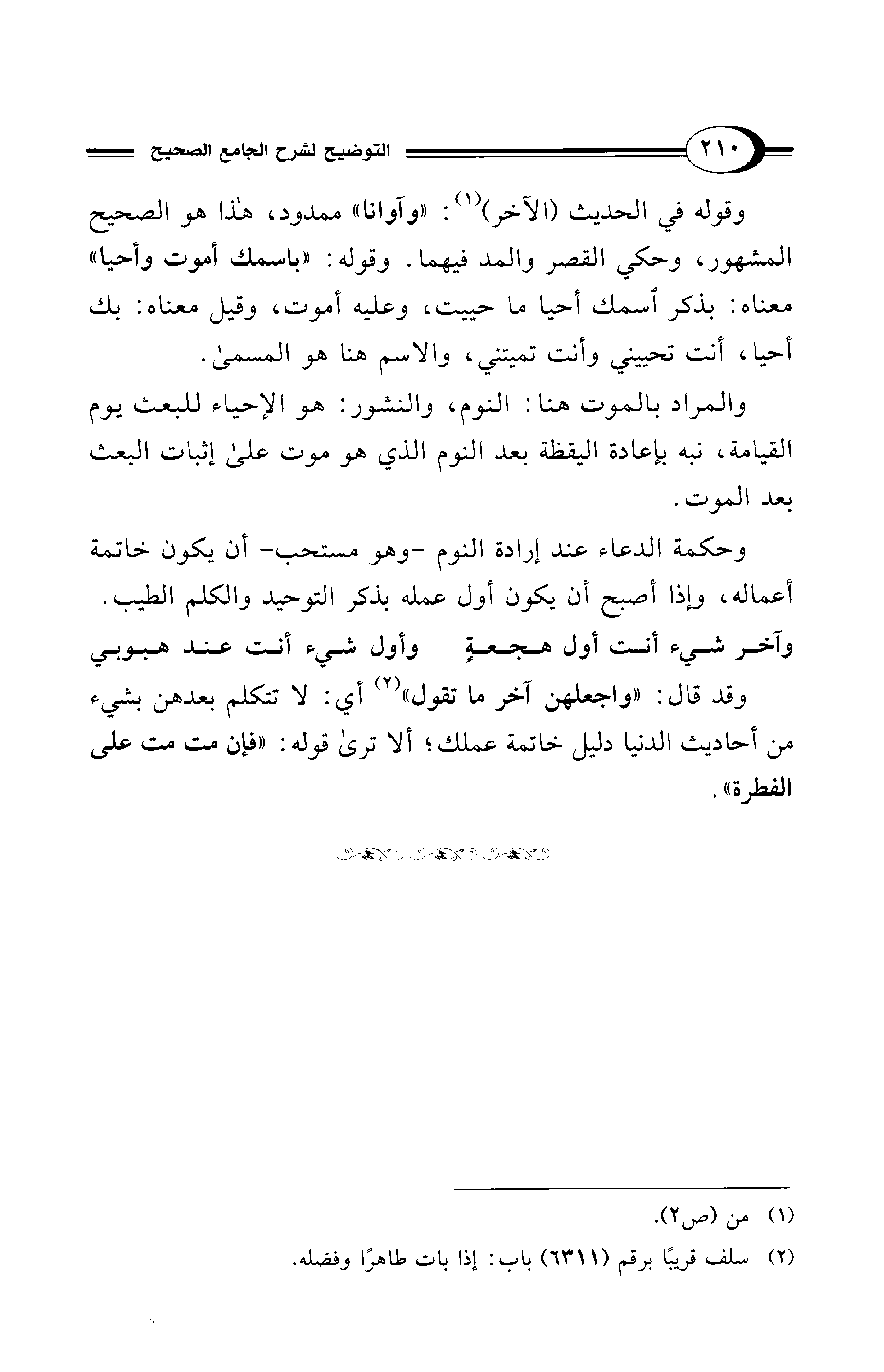 وحكمة الدعاء عند إرادة النوم -وهو مستحب- أن يكون خاتمة أعماله، وإذا أصبح أن يكون أول عمله بذكر التوحيد والكلم الطيب.