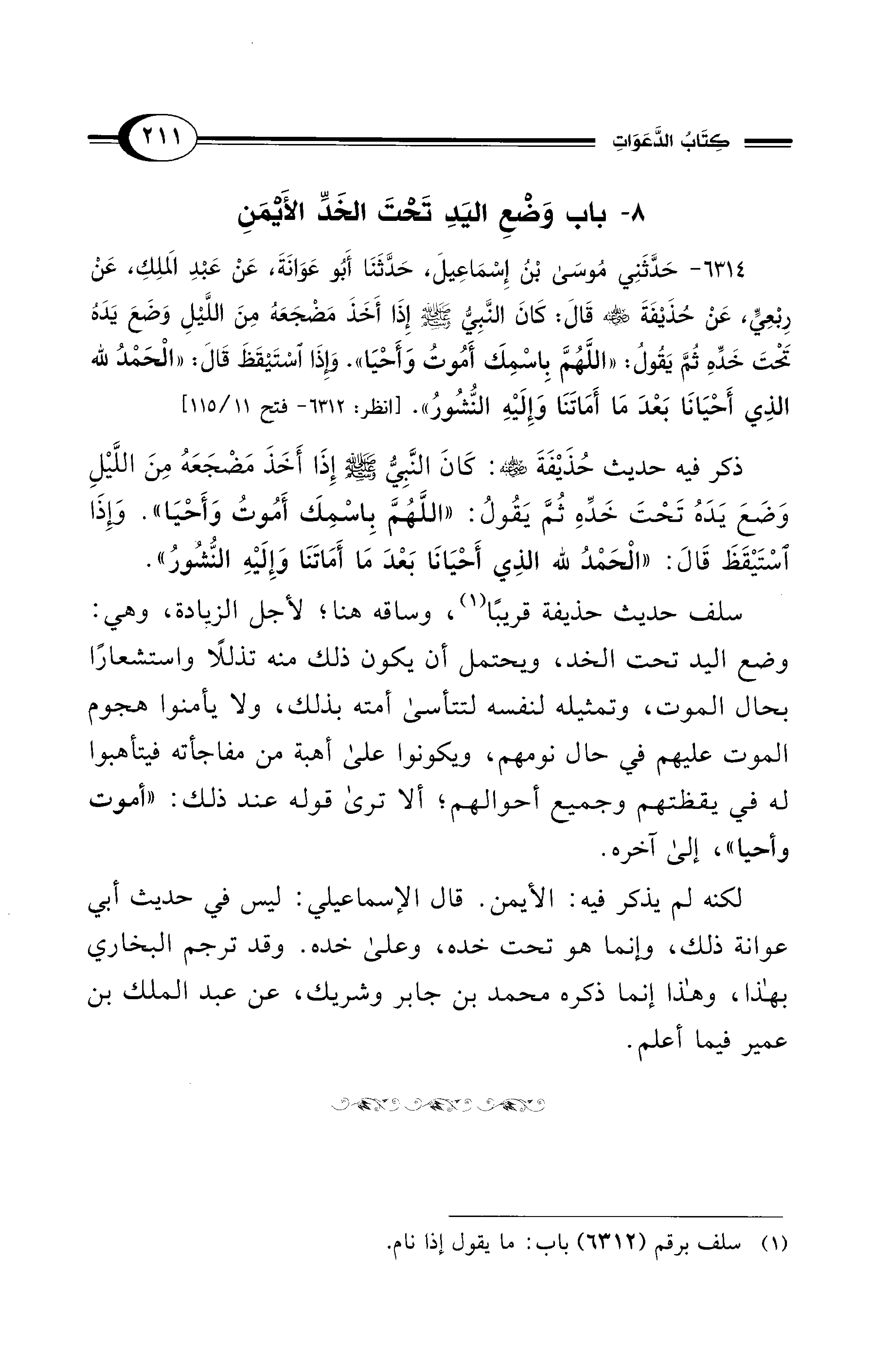 6314 - حَدَّثَنِي مُوسَى بْنُ إِسْمَاعِيلَ، حَدَّثَنَا أَبُو عَوَانَةَ، عَنْ عَبْدِ المَلِكِ، عَنْ رِبْعِيٍّ، عَنْ حُذَيْفَةَ - رضي الله عنه - قَالَ: كَانَ النَّبِيُّ - صلى الله عليه وسلم - إِذَا أَخَذَ مَضْجَعَهُ مِنَ اللَّيْلِ وَضَعَ يَدَهُ تَحْتَ خَدِّهِ ثُمَّ يَقُولُ: «اللَّهُمَّ بِاسْمِكَ أَمُوتُ وَأَحْيَا». وَإِذَا اسْتَيْقَظَ قَالَ: «الْحَمْدُ لِلَّهِ الَّذِي أَحْيَانَا بَعْدَ مَا أَمَاتَنَا وَإِلَيْهِ النُّشُورُ». [انظر: 6312 - فتح 11/ 115]