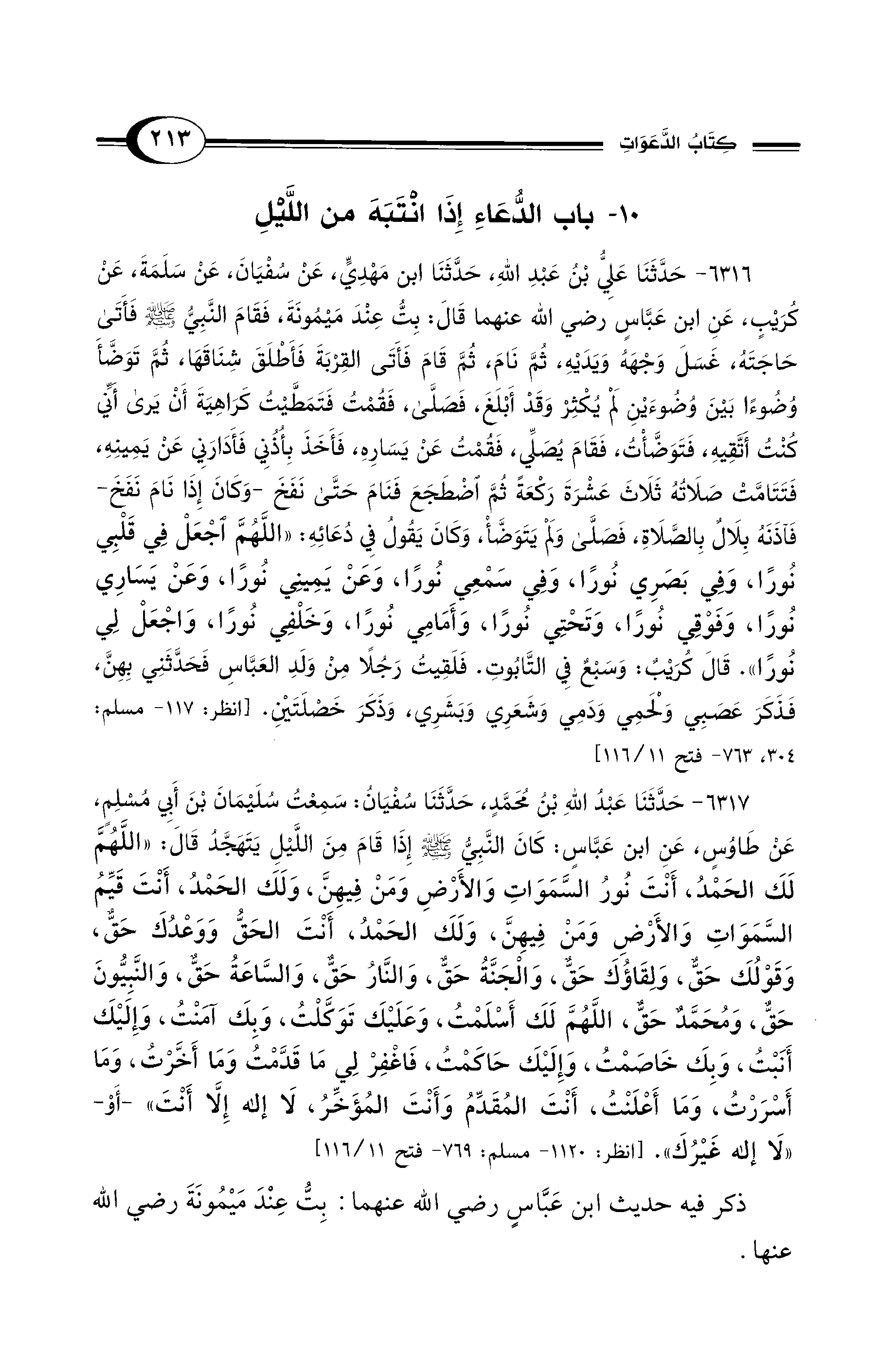 6317 - حَدَّثَنَا عَبْدُ اللهِ بْنُ مُحَمَّدٍ، حَدَّثَنَا سُفْيَانُ: سَمِعْتُ سُلَيْمَانَ بْنَ أَبِي مُسْلِمٍ، عَنْ طَاوُسٍ، عَنِ ابْنِ عَبَّاسٍ: كَانَ النَّبِيُّ - صلى الله عليه وسلم - إِذَا قَامَ مِنَ اللَّيْلِ يَتَهَجَّدُ قَالَ: «اللَّهُمَّ لَكَ الْحَمْدُ، أَنْتَ نُورُ السَّمَوَاتِ وَالأَرْضِ وَمَنْ فِيهِنَّ، وَلَكَ الْحَمْدُ، أَنْتَ قَيِّمُ السَّمَوَاتِ وَالأَرْضِ وَمَنْ فِيهِنَّ، وَلَكَ الْحَمْدُ، أَنْتَ الْحَقُّ وَوَعْدُكَ حَقٌّ، وَقَوْلُكَ حَقٌّ، وَلِقَاؤُكَ حَقٌّ، وَالْجَنَّةُ حَقٌّ، وَالنَّارُ حَقٌّ، وَالسَّاعَةُ حَقٌّ، وَالنَّبِيُّونَ حَقٌّ، وَمُحَمَّدٌ حَقٌّ، اللَّهُمَّ لَكَ أَسْلَمْتُ، وَعَلَيْكَ تَوَكَّلْتُ، وَبِكَ آمَنْتُ، وَإِلَيْكَ أَنَبْتُ، وَبِكَ خَاصَمْتُ، وَإِلَيْكَ حَاكَمْتُ، فَاغْفِرْ لِي مَا قَدَّمْتُ وَمَا أَخَّرْتُ، وَمَا أَسْرَرْتُ، وَمَا أَعْلَنْتُ، أَنْتَ الْمُقَدِّمُ وَأَنْتَ الْمُؤَخِّرُ، لاَ إِلَهَ إِلاَّ أَنْتَ" -أَوْ- "لاَ إِلَهَ غَيْرُكَ". [انظر: 1120 - مسلم: 769 - فتح 11/ 116]