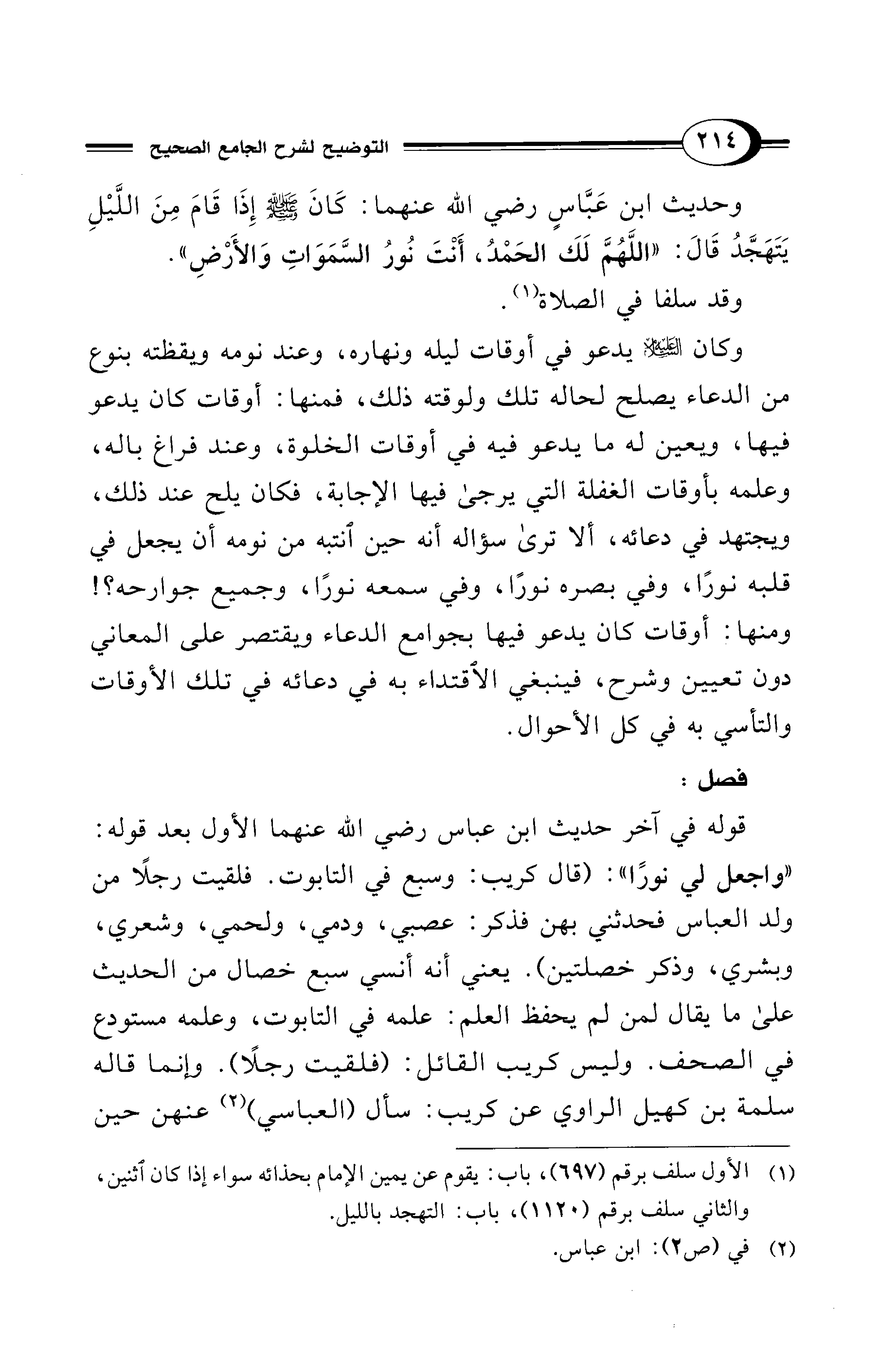 وحديث ابن عَبَّاسٍ - رضي الله عنهما -: كَانَ - صلى الله عليه وسلم - إِذَا قَامَ مِنَ اللَّيْلِ يَتَهَجَّدُ قَالَ: "اللَّهُمَّ لَكَ الحَمْدُ، أَنْتَ نُورُ السَّمَوَاتِ وَالأَرْضِ".