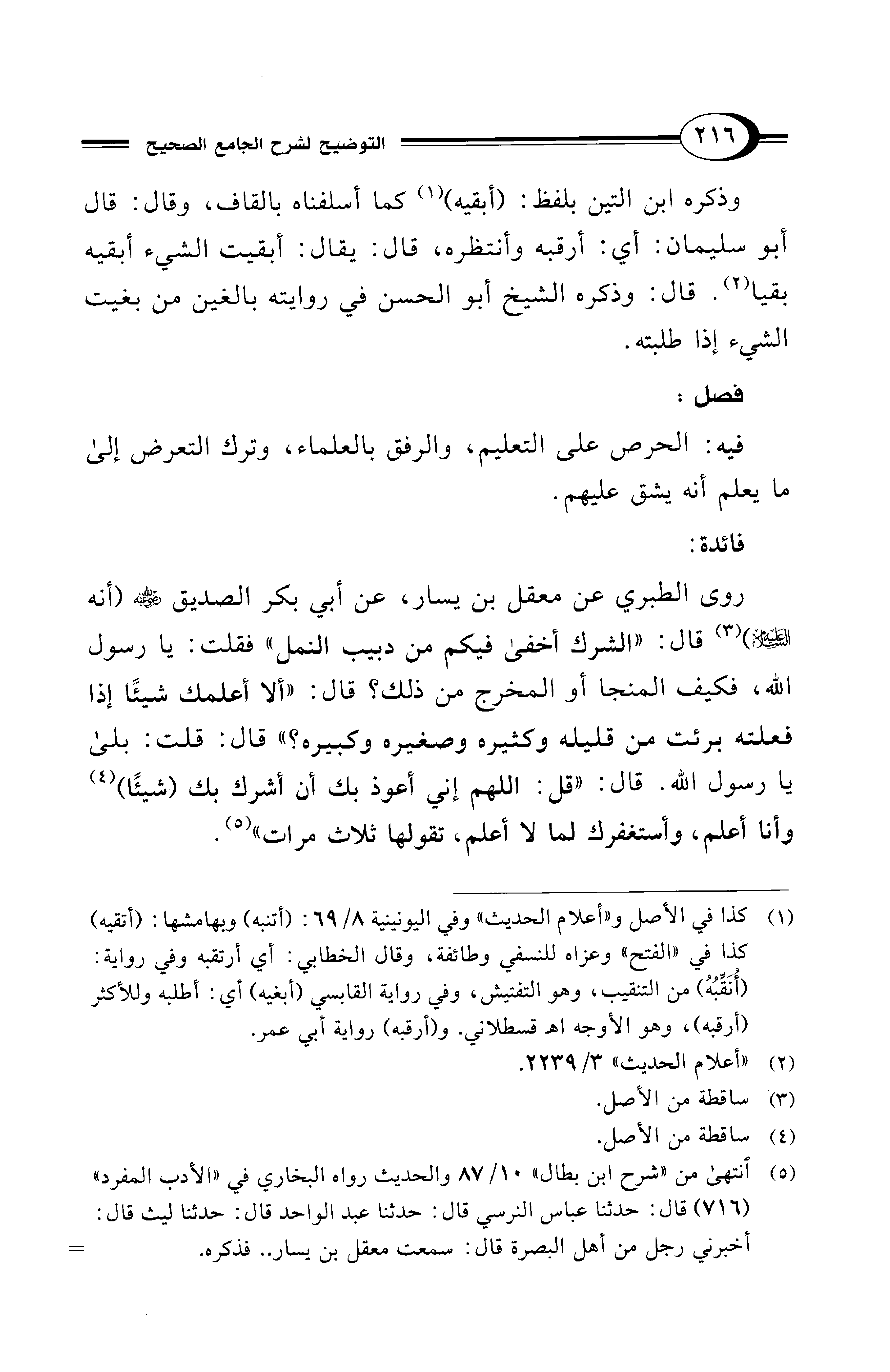 روى الطبري عن معقل بن يسار، عن أبي بكر الصديق - رضي الله عنه - (أنه - عليه السلام -) (¬3) قال: "الشرك أخفى فيكم من دبيب النمل" فقلت: يا رسول الله، فكيف المنجا أو المخرج من ذلك؟ قال: "ألا أعلمك شيئًا إذا فعلته برئت من قليله وكثيره وصغيره وكبيره؟ " قال: قلت: بلى يا رسول الله. قال: "قل: اللهم إني أعوذ بك أن أشرك بك (شيئًا) (¬4) وأنا أعلم، وأستغفرك لما لا أعلم، تقولها ثلاث مرات" (¬5).