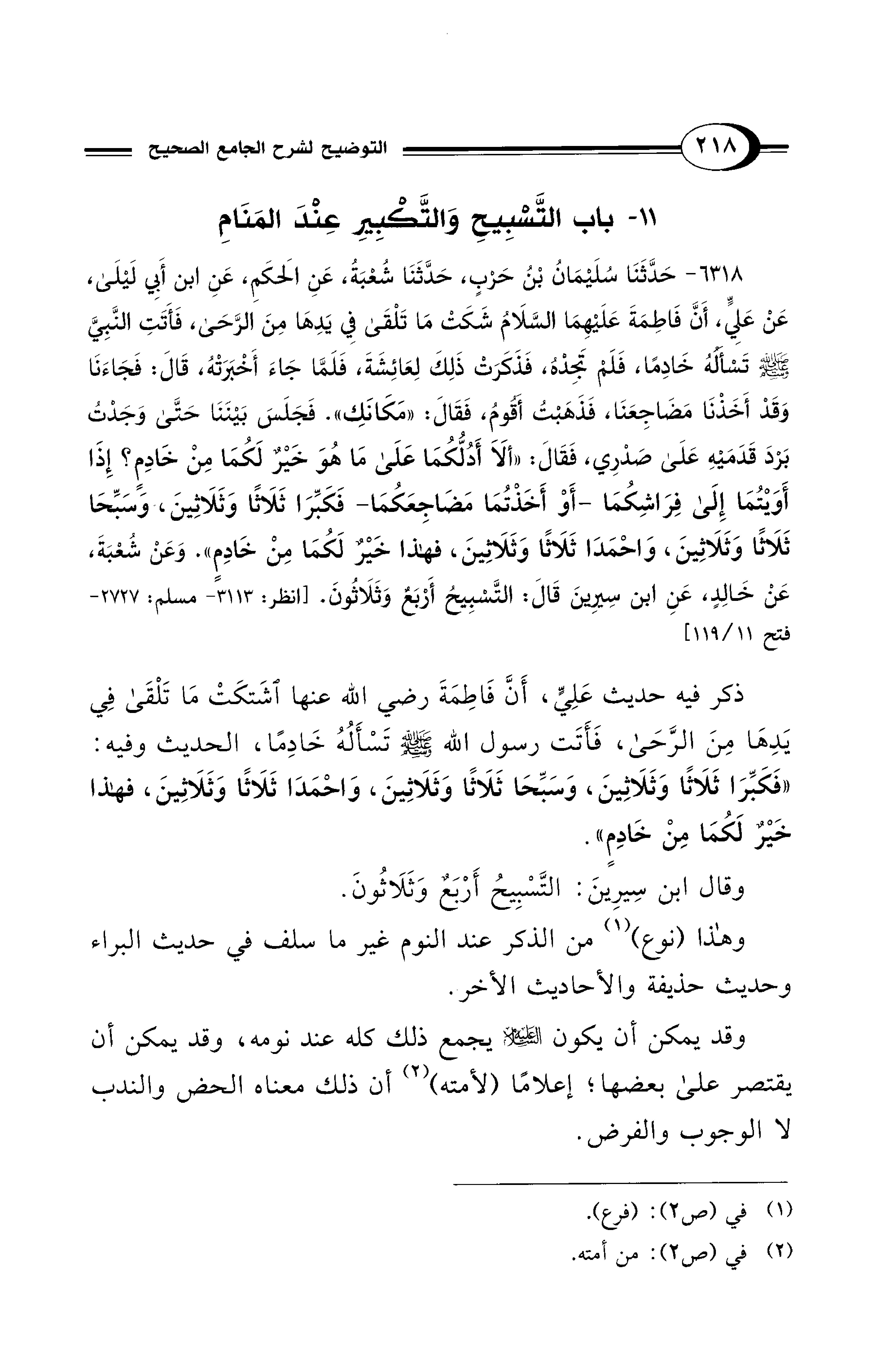 6318 - حَدَّثَنَا سُلَيْمَانُ بْنُ حَرْبٍ، حَدَّثَنَا شُعْبَةُ، عَنِ الْحَكَمِ، عَنِ ابْنِ أَبِي لَيْلَى، عَنْ عَلِيٍّ، أَنَّ فَاطِمَةَ - عَلَيْهِمَا السَّلاَمُ - شَكَتْ مَا تَلْقَى فِي يَدِهَا مِنَ الرَّحَى، فَأَتَتِ النَّبِيَّ - صلى الله عليه وسلم - تَسْأَلُهُ خَادِمًا، فَلَمْ تَجِدْهُ، فَذَكَرَتْ ذَلِكَ لِعَائِشَةَ، فَلَمَّا جَاءَ أَخْبَرَتْهُ. قَالَ: فَجَاءَنَا وَقَدْ أَخَذْنَا مَضَاجِعَنَا، فَذَهَبْتُ أَقُومُ، فَقَالَ: «مَكَانَكِ». فَجَلَسَ بَيْنَنَا حَتَّى وَجَدْتُ بَرْدَ قَدَمَيْهِ عَلَى صَدْرِي، فَقَالَ: «أَلاَ أَدُلُّكُمَا عَلَى مَا هُوَ خَيْرٌ لَكُمَا مِنْ خَادِمٍ؟ إِذَا أَوَيْتُمَا إِلَى فِرَاشِكُمَا -أَوْ أَخَذْتُمَا مَضَاجِعَكُمَا- فَكَبِّرَا ثَلاَثًا وَثَلاَثِينَ، وَسَبِّحَا ثَلاَثًا وَثَلاَثِينَ، وَاحْمَدَا ثَلاَثًا وَثَلاَثِينَ، فَهَذَا خَيْرٌ لَكُمَا مِنْ خَادِمٍ». وَعَنْ شُعْبَةَ، عَنْ خَالِدٍ، عَنِ ابْنِ سِيرِينَ قَالَ: التَّسْبِيحُ أَرْبَعٌ وَثَلاَثُونَ. [انظر: 3113 - مسلم: 2727 -