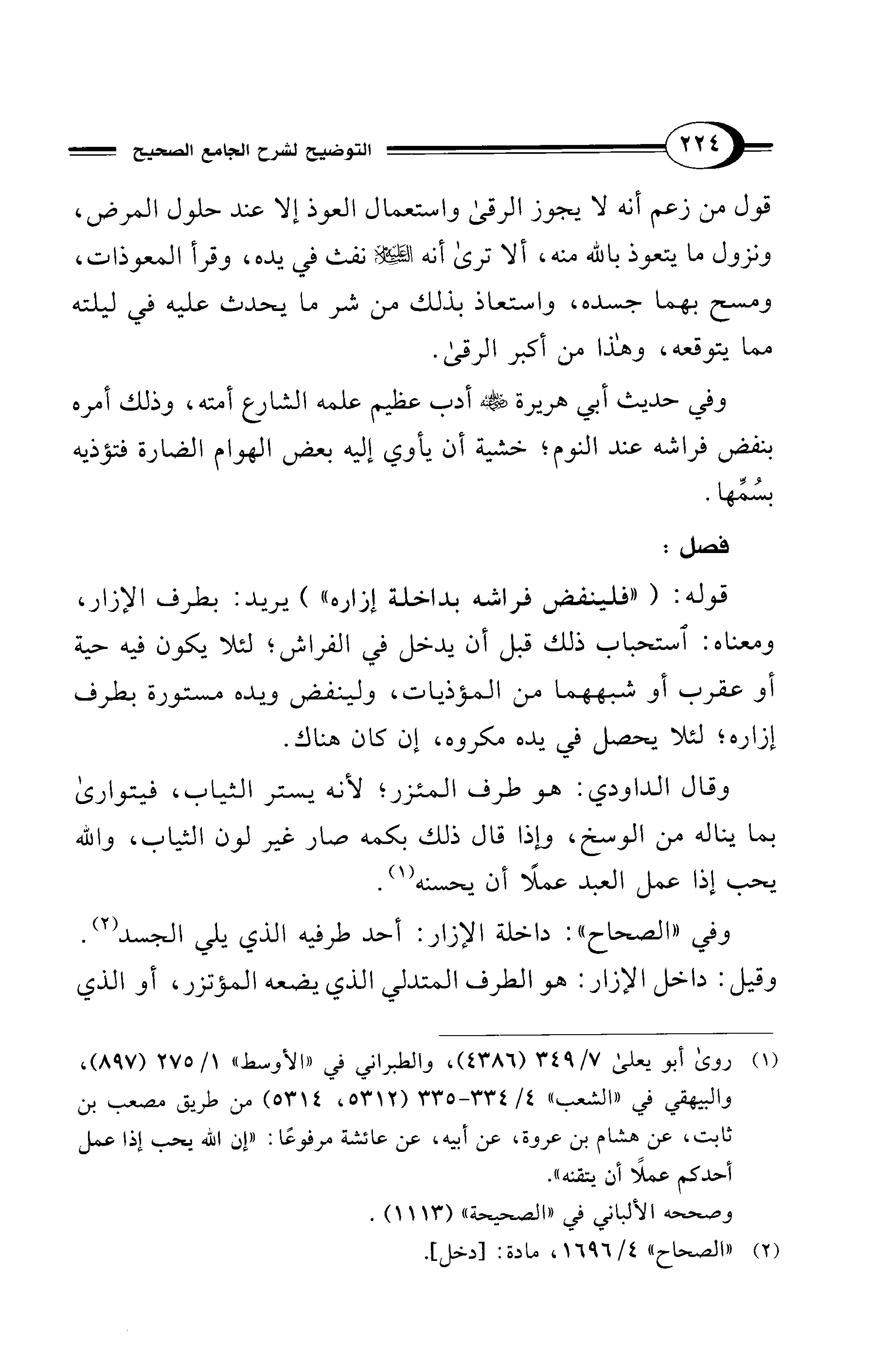 وفي حديث أبي هريرة - رضي الله عنه - أدب عظيم علمه الشارع أمته، وذلك أمره بنفض فراشه عند النوم، خشية أن يأوي إليه بعض الهوام الضارة فتؤذيه بسُمِّها.