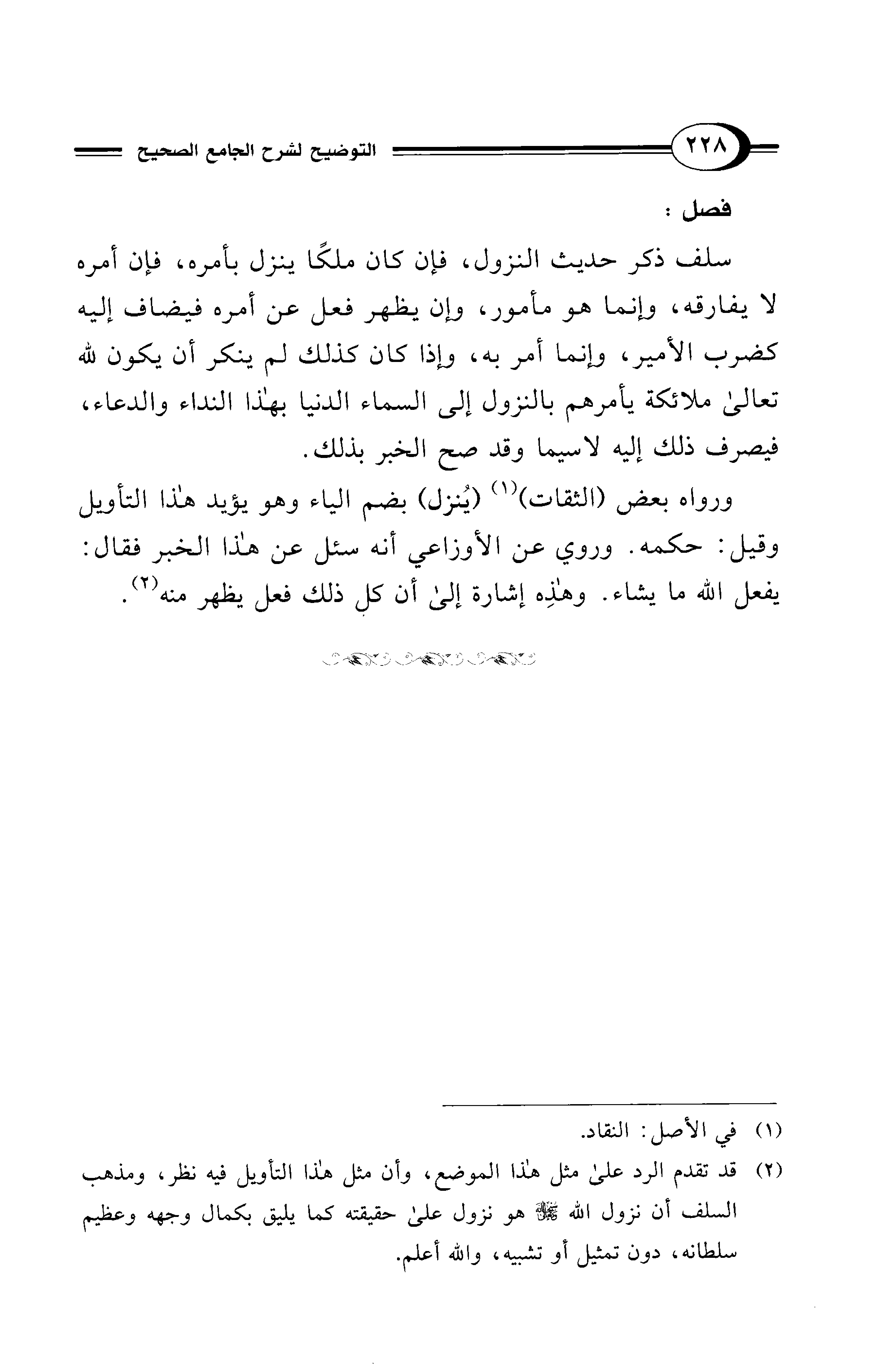 (¬2) قد تقدم الرد على مثل هذا الموضع، وأن مثل هذا التأويل فيه نظر، ومذهب السلف أن نزول الله - سبحانه وتعالى - هو نزول على حقيقته كما يليق بكمال وجهه وعظيم سلطانه، دون تمثيل أو تشبيه، والله أعلم.