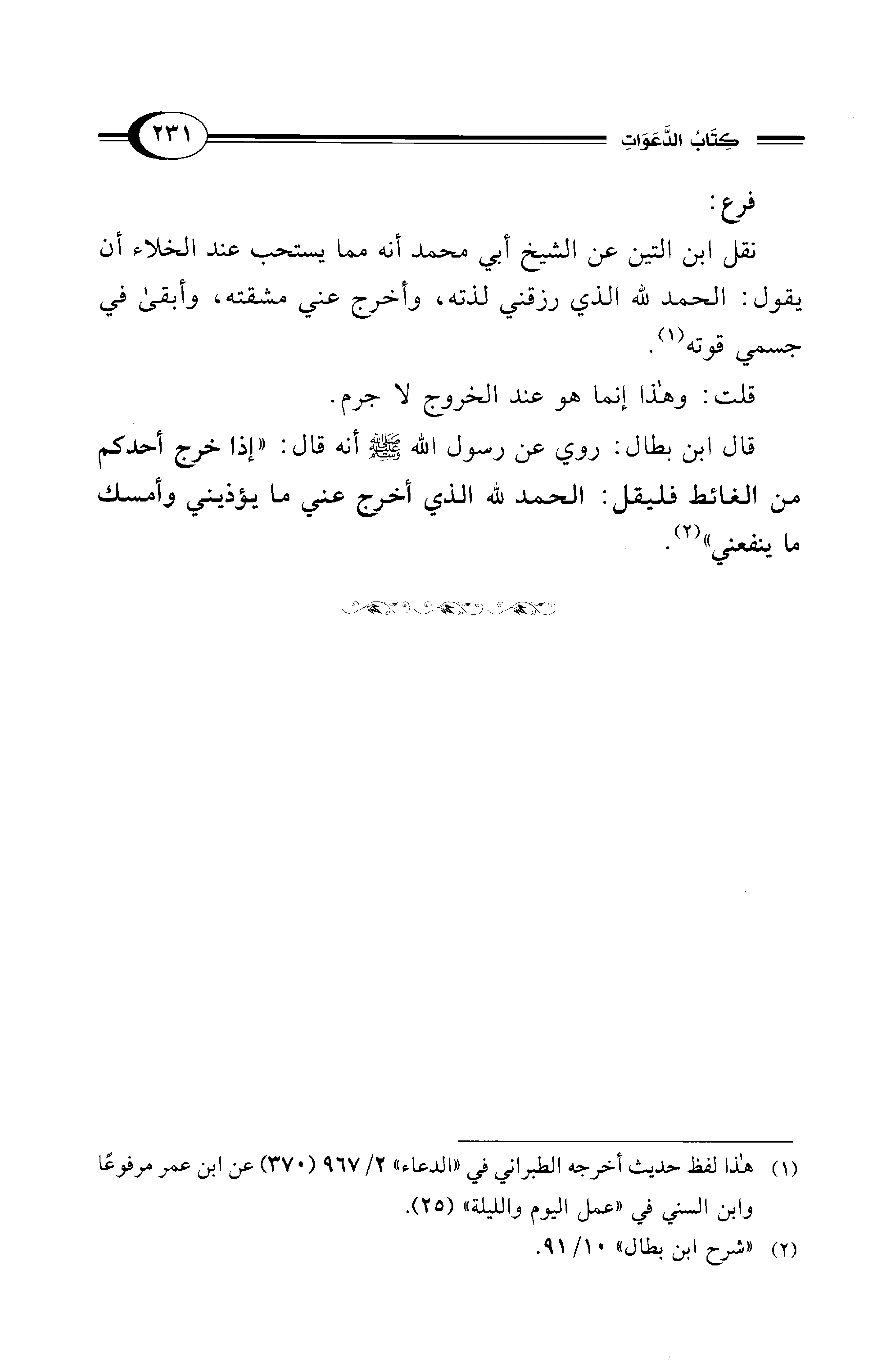قال ابن بطال: روي عن رسول الله _ صلى الله عليه وسلم _ أنه قال: "إذا خرج أحدكم من الغائط فليقل: الحمد لله الذي أخرج عني ما يؤذيني وأمسك ما ينفعني" (¬2).