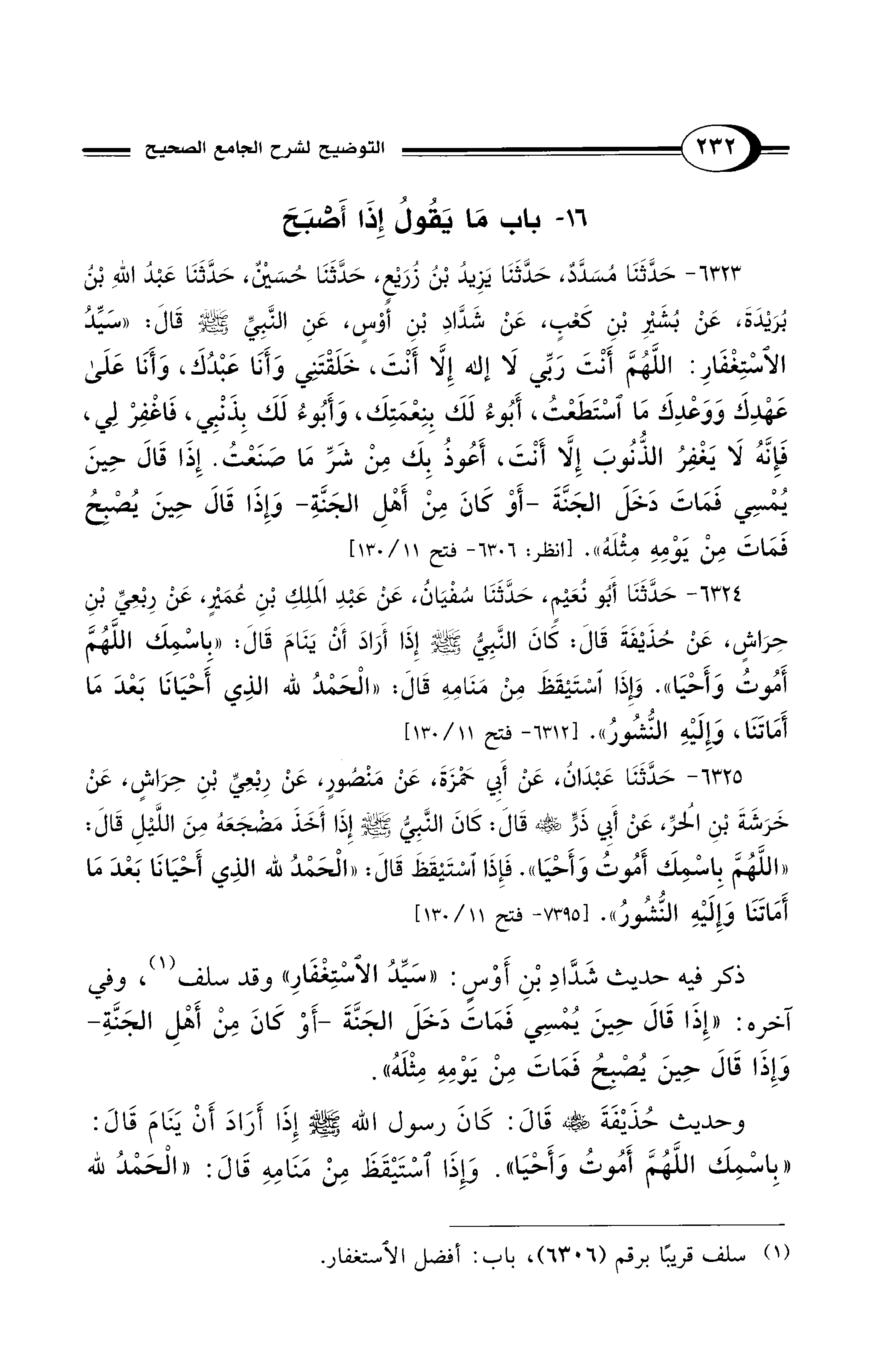 6323 - حَدَّثَنَا مُسَدَّدٌ، حَدَّثَنَا يَزِيدُ بْنُ زُرَيْعٍ، حَدَّثَنَا حُسَيْنٌ، حَدَّثَنَا عَبْدُ اللهِ بْنُ بُرَيْدَةَ، عَنْ بُشَيْرِ بْنِ كَعْبٍ، عَنْ شَدَّادِ بْنِ أَوْسٍ، عَنِ النَّبِيِّ - صلى الله عليه وسلم - قَالَ: «سَيِّدُ الاِسْتِغْفَارِ: اللَّهُمَّ أَنْتَ رَبِّي لاَ إِلَهَ إِلاَّ أَنْتَ، خَلَقْتَنِي وَأَنَا عَبْدُكَ، وَأَنَا عَلَى عَهْدِكَ وَوَعْدِكَ مَا اسْتَطَعْتُ، أَبُوءُ لَكَ بِنِعْمَتِكَ، وَأَبُوءُ لَكَ بِذَنْبِي، فَاغْفِرْ لِي، فَإِنَّهُ لاَ يَغْفِرُ الذُّنُوبَ إِلاَّ أَنْتَ، أَعُوذُ بِكَ مِنْ شَرِّ مَا صَنَعْتُ. إِذَا قَالَ حِينَ يُمْسِى فَمَاتَ دَخَلَ الْجَنَّةَ -أَوْ كَانَ مِنْ أَهْلِ الْجَنَّةِ- وَإِذَا قَالَ حِينَ يُصْبِحُ فَمَاتَ مِنْ يَوْمِهِ مِثْلَهُ". [انظر: 6306 - فتح 11/ 130]