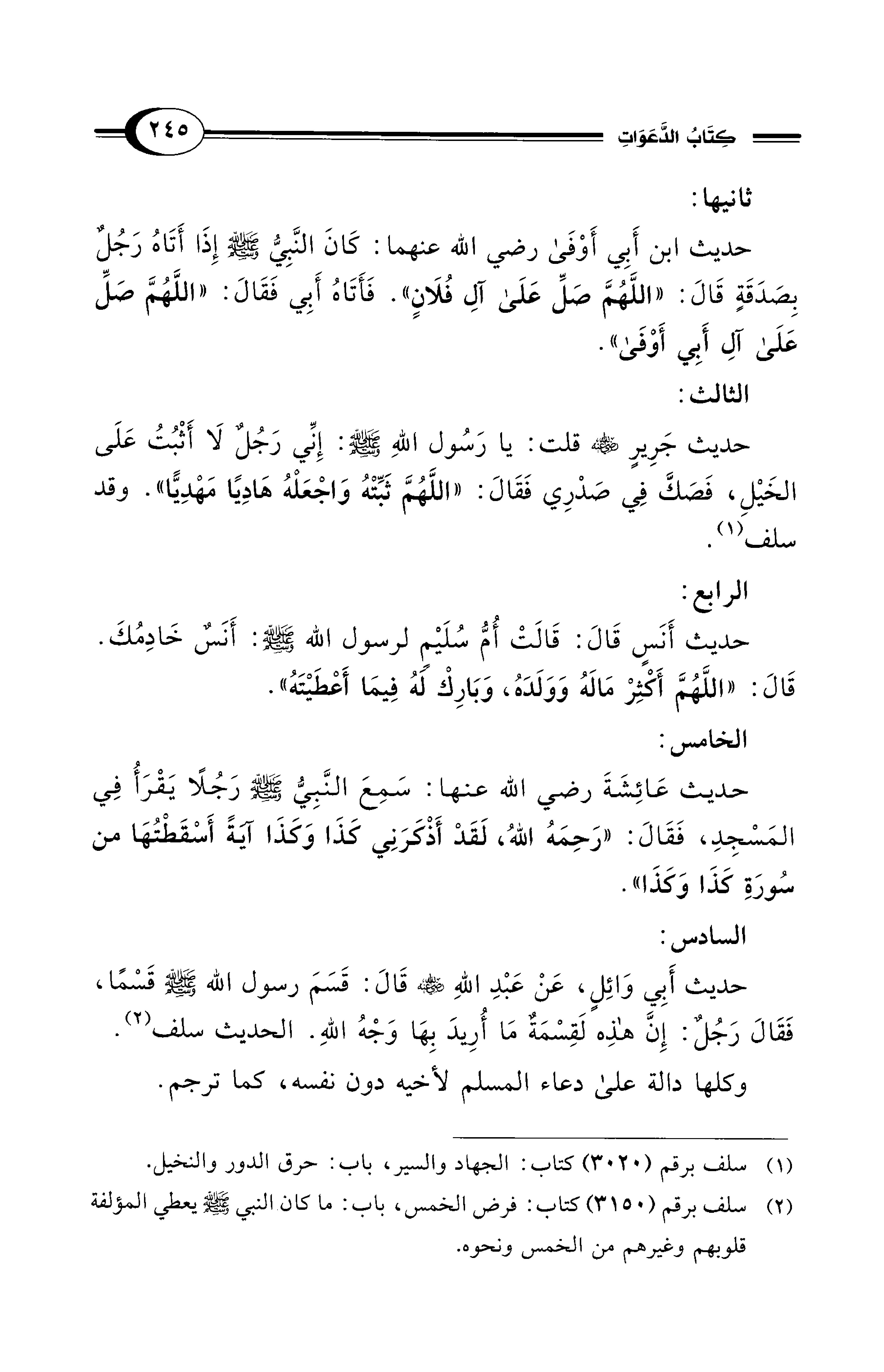 حديث ابن أَبِي أَوْفَى - رضي الله عنهما -: كَانَ النَّبِيُّ - صلى الله عليه وسلم - إِذَا أَتَاهُ رَجُلٌ بِصَدَقَةٍ قَالَ: "اللَّهُمَّ صَلِّ عَلَى آلِ فُلَانٍ". فَأَتَاهُ أَبِي فَقَالَ: "اللَّهُمَّ صَلِّ عَلَى آلِ أَبِي أَوْفَى".