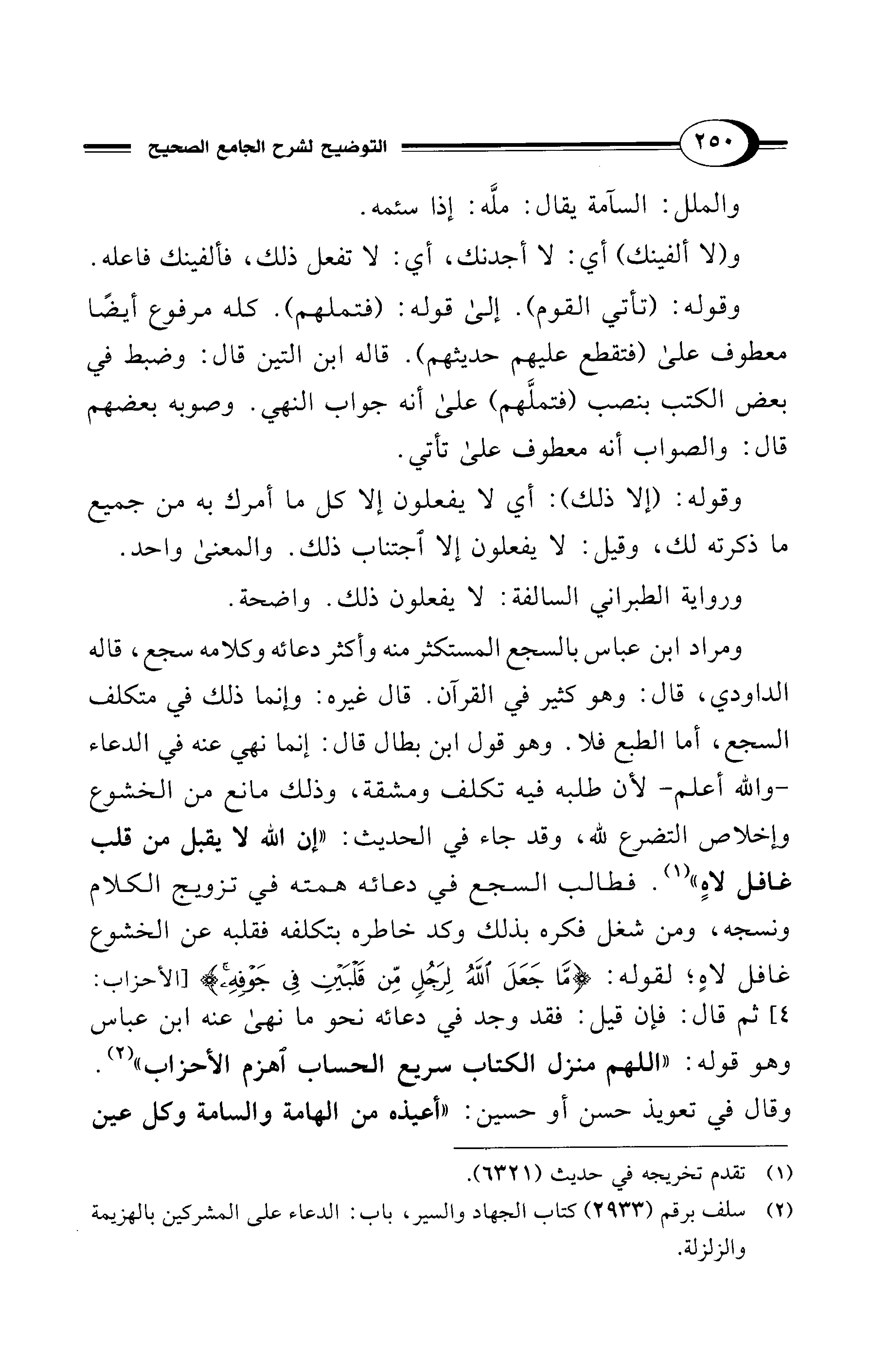 ومراد ابن عباس بالسجع المستكثر منه وأكثر دعائه وكلامه سجع، قاله الداودي، قال: وهو كثير في القرآن. قال غيره: وإنما ذلك في متكلف السجع، أما الطبع فلا. وهو قول ابن بطال قال: إنما نهي عنه في الدعاء -والله أعلم- لأن طلبه فيه تكلف ومشقة، وذلك مانع من الخشوع وإخلاص التضرع لله، وقد جاء في الحديث: "إن الله لا يقبل من قلب غافل لاهٍ" (¬1). فطالب السجع في دعائه همته في تزويج الكلام ونسجه، ومن شغل فكره بذلك وكد خاطره بتكلفه فقلبه عن الخشوع غافل لاهٍ؛ لقوله: {مَا جَعَلَ اللهُ لِرَجُلٍ مِنْ قَلْبَيْنِ فِي جَوْفِهِ} [الأحزاب: 4] ثم قال: فإن قيل: فقد وجد في دعائه نحو ما نهى عنه ابن عباس وهو قوله: "اللهم منزل الكتاب سريع الحساب اهزم الأحزاب" (¬2). وقال في تعويذ حسن أو حسين: "أعيذه من الهامة والسامة وكل عين