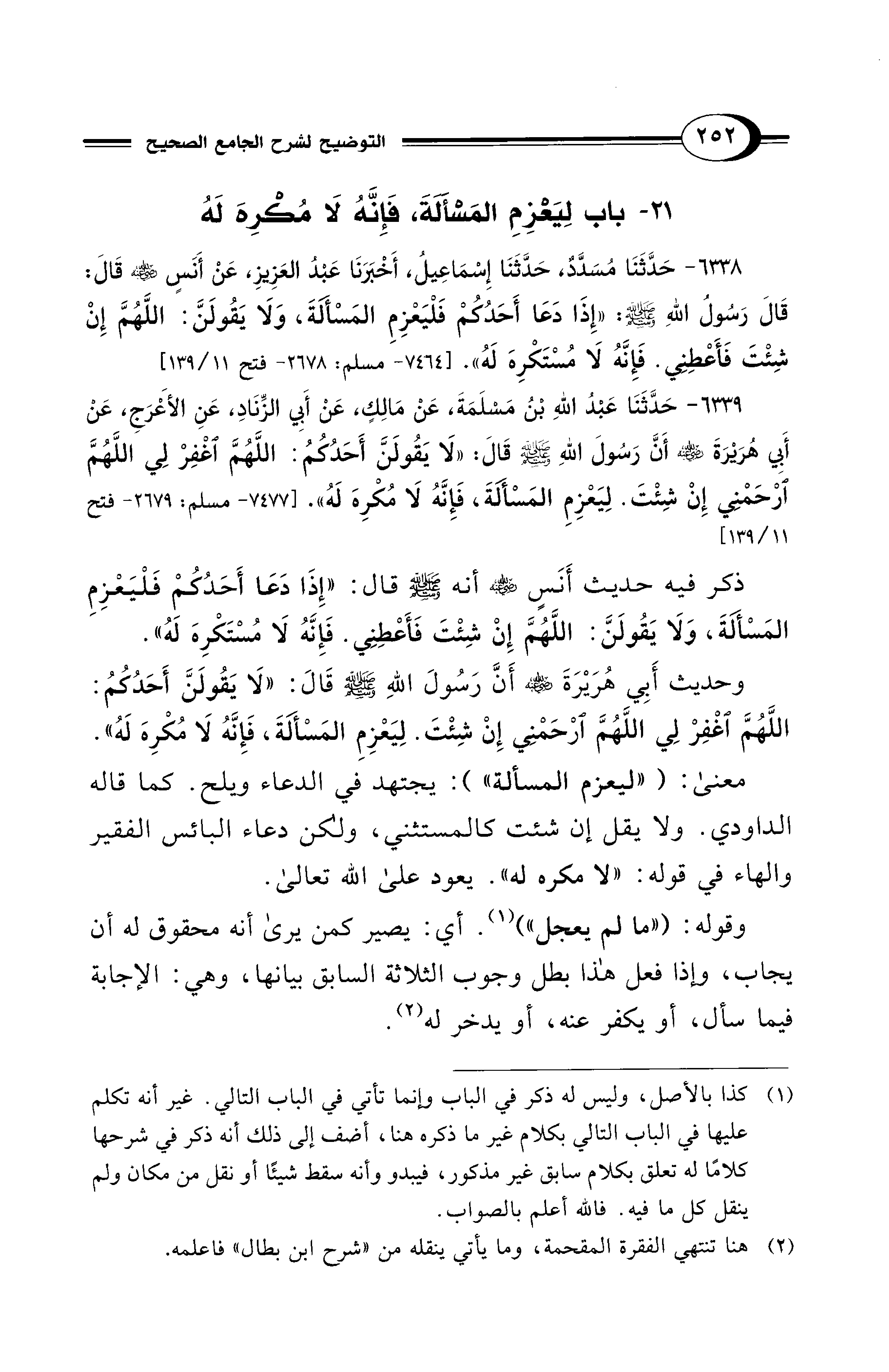6338 - حَدَّثَنَا مُسَدَّدٌ، حَدَّثَنَا إِسْمَاعِيلُ، أَخْبَرَنَا عَبْدُ الْعَزِيزِ، عَنْ أَنَسٍ - رضي الله عنه - قَالَ: قَالَ رَسُولُ اللهِ - صلى الله عليه وسلم -: «إِذَا دَعَا أَحَدُكُمْ فَلْيَعْزِمِ المَسْأَلَةَ، وَلاَ يَقُولَنَّ: اللَّهُمَّ إِنْ شِئْتَ فَأَعْطِنِي. فَإِنَّهُ لاَ مُسْتَكْرِهَ لَهُ». [7464 - مسلم: 2678 - فتح 11/ 139]