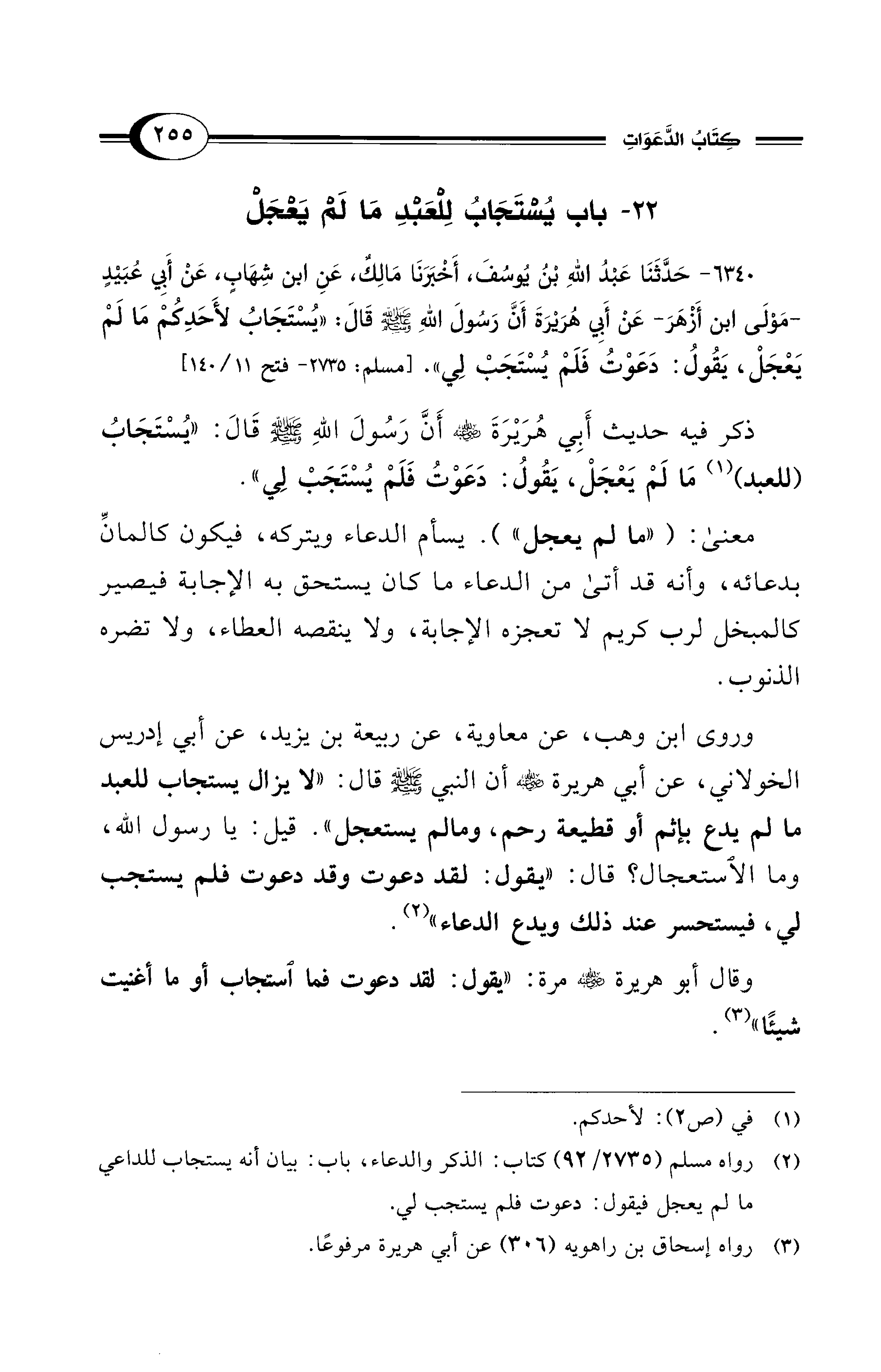 6340 - حَدَّثَنَا عَبْدُ اللهِ بْنُ يُوسُفَ، أَخْبَرَنَا مَالِكٌ، عَنِ ابْنِ شِهَابٍ، عَنْ أَبِي عُبَيْدٍ -مَوْلَى ابْنِ أَزْهَرَ- عَنْ أَبِي هُرَيْرَةَ أَنَّ رَسُولَ اللهِ - صلى الله عليه وسلم - قَالَ: «يُسْتَجَابُ لأَحَدِكُمْ مَا لَمْ يَعْجَلْ، يَقُولُ دَعَوْتُ فَلَمْ يُسْتَجَبْ لِي». [مسلم: 2735 - فتح 11/ 140]