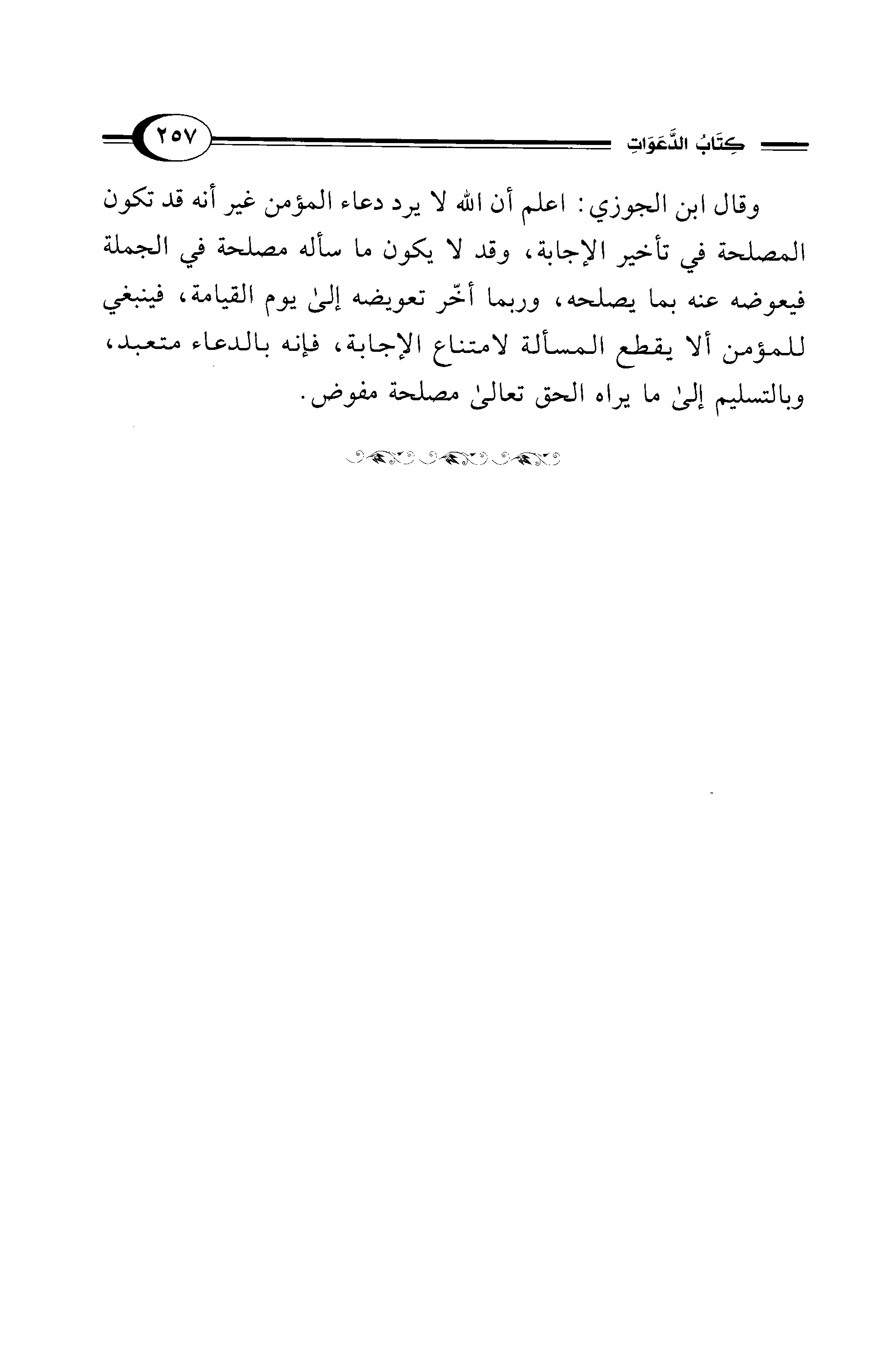 وقال ابن الجوزي: اعلم أن الله لا يرد دعاء المؤمن غير أنه قد تكون المصلحة في تأخير الإجابة، وقد لا يكون ما سأله مصلحة في الجملة فيعوضه عنه بما يصلحه، وربما أخّر تعويضه إلى يوم القيامة، فينبغي للمؤمن ألا يقطع المسألة لامتناع الإجابة، فإنه بالدعاء متعبد، وبالتسليم إلى ما يراه الحق تعالى مصلحة مفوض.