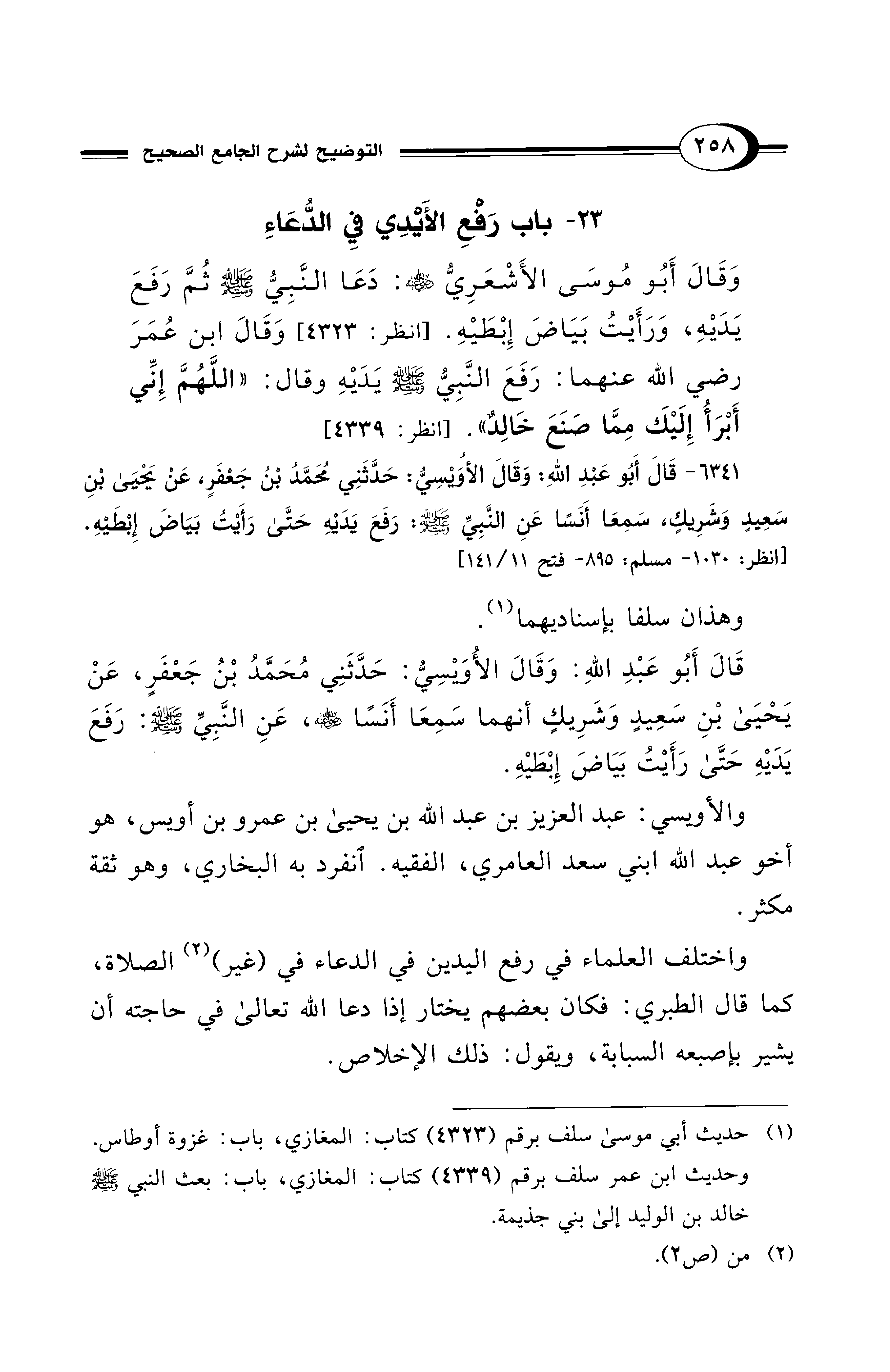وَقَالَ أَبُو مُوسَى الأَشْعَرِيُّ - رضي الله عنه -: دَعَا النَّبِيُّ - صلى الله عليه وسلم - ثُمَّ رَفَعَ يَدَيْهِ، وَرَأَيْتُ بَيَاضَ إِبْطَيْهِ. [انظر: 4323] وَقَالَ ابن عُمَرَ - رضي الله عنهما -: رَفَعَ النَّبِيُّ - صلى الله عليه وسلم - يَدَيْهِ وقال: "اللَّهُمَّ إِنِّي أَبْرَأُ إِلَيْكَ مِمَّا صَنَعَ خَالِدٌ". [انظر: 4339]