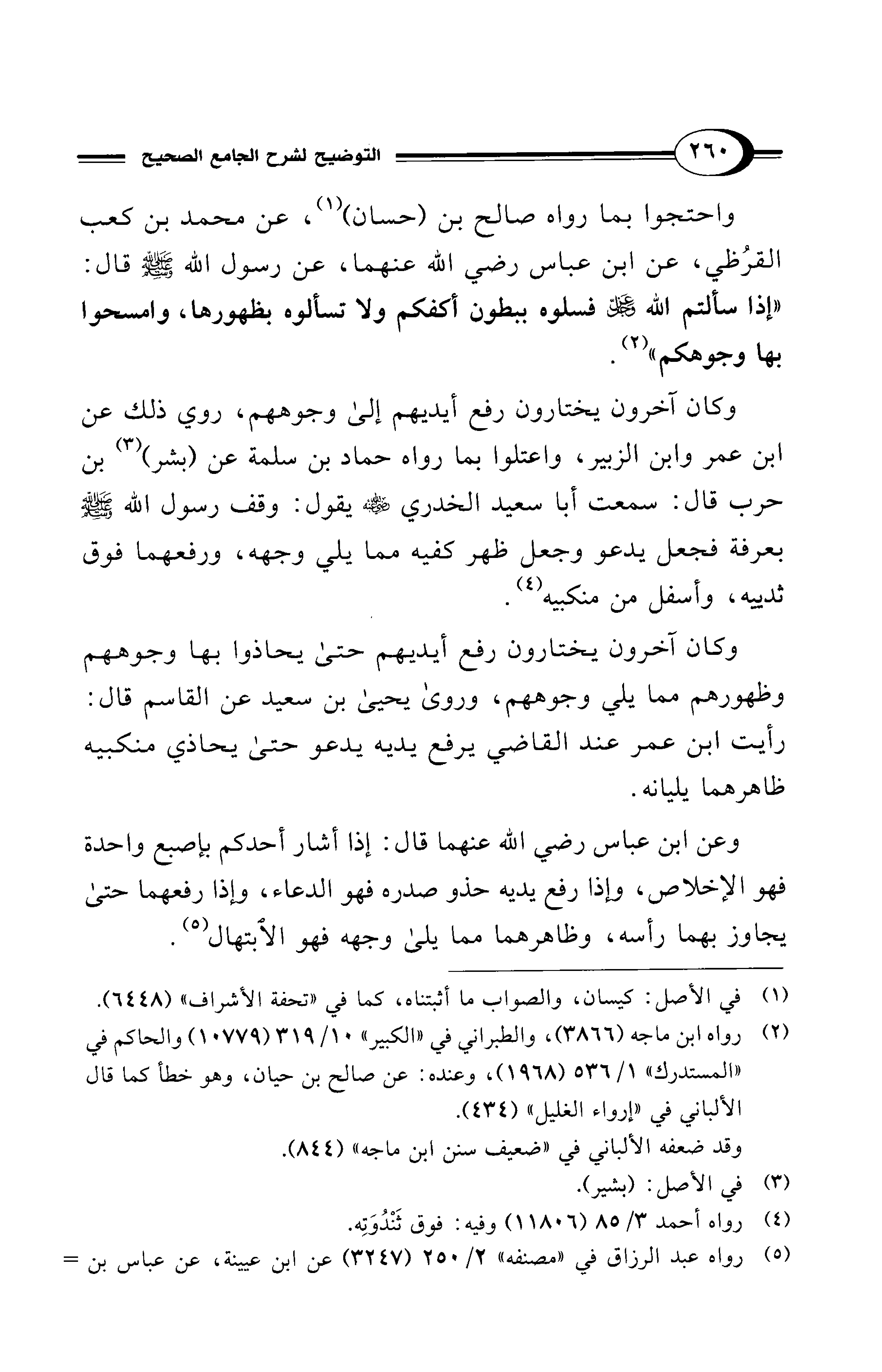 واحتجوا بما رواه صالح بن (حسان) (¬1)، عن محمد بن كعب القرُظي، عن ابن عباس - رضي الله عنهما -، عن رسول الله - صلى الله عليه وسلم - قال "إذا سألتم الله -عَزَّ وَجَلَّ- فسلوه ببطون أكفكم ولا تسألوه بظهورها، وامسحوا بها وجوهكم" (¬2).