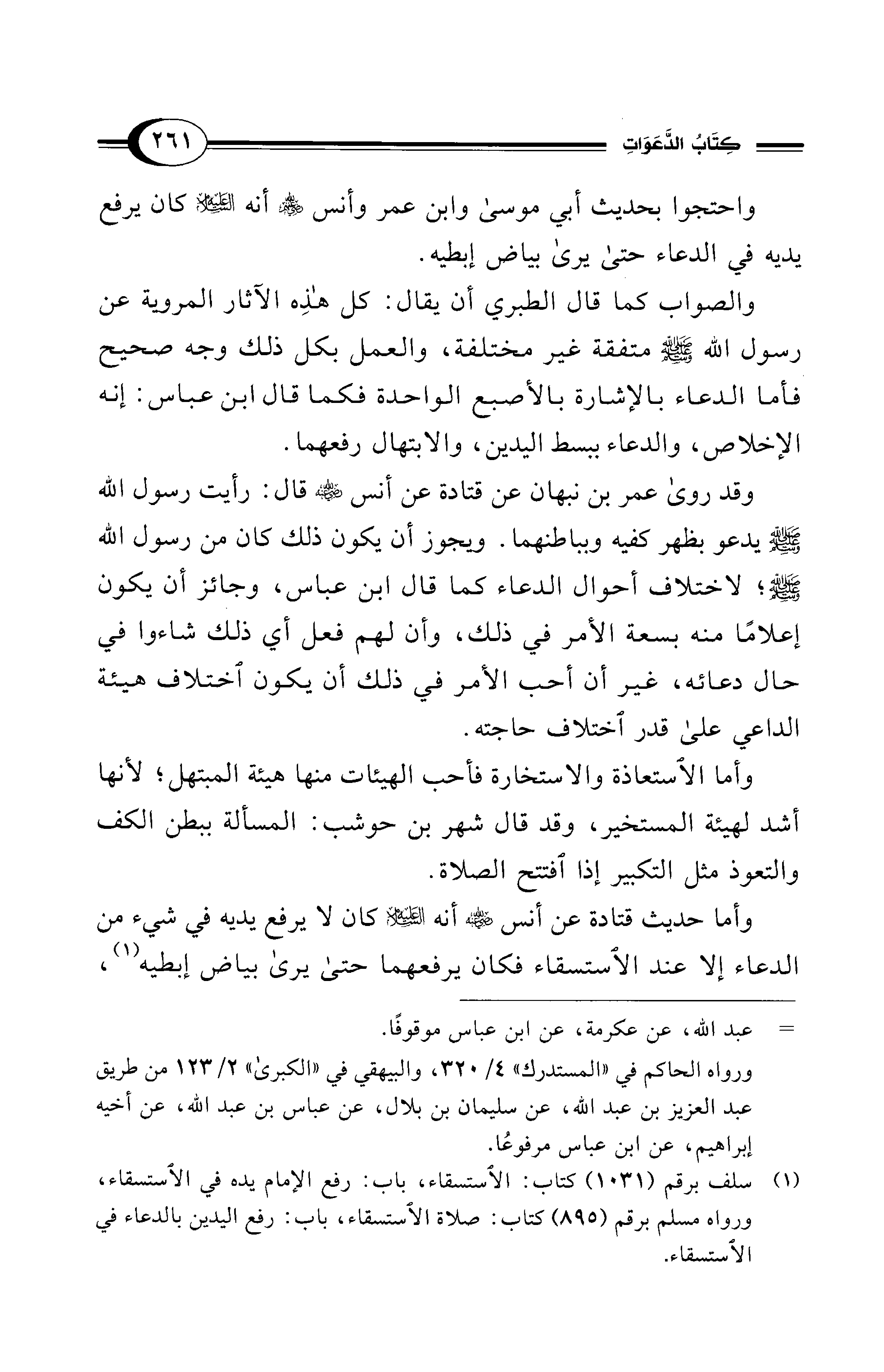 والصواب كما قال الطبري أن يقال: كل هذِه الآثار المروية عن رسول الله - صلى الله عليه وسلم - متفقة غير مختلفة، والعمل بكل ذلك وجه صحيح فأما الدعاء بالإشارة بالأصبع الواحدة فكما قال ابن عباس: إنه الإخلاص، والدعاء ببسط اليدين، والابتهال رفعهما.