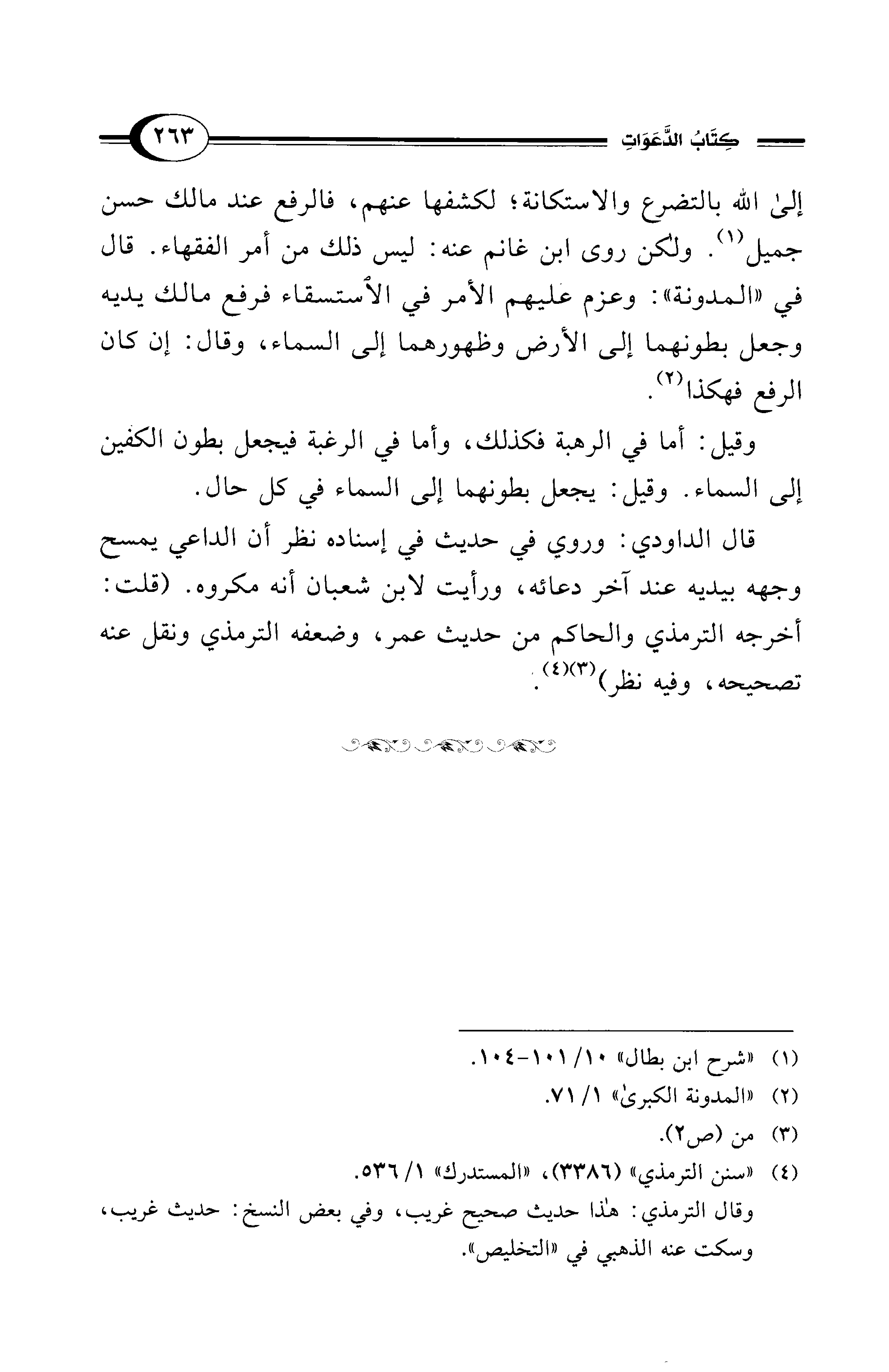 قال الداودي: وروي في حديث في إسناده نظر أن الداعي يمسح وجهه بيديه عند آخر دعائه، ورأيت لابن شعبان أنه مكروه. (قلت: أخرجه الترمذي والحاكم من حديث عمر، وضعفه الترمذي ونقل عنه تصحيحه، وفيه نظر) (¬3) (¬4).