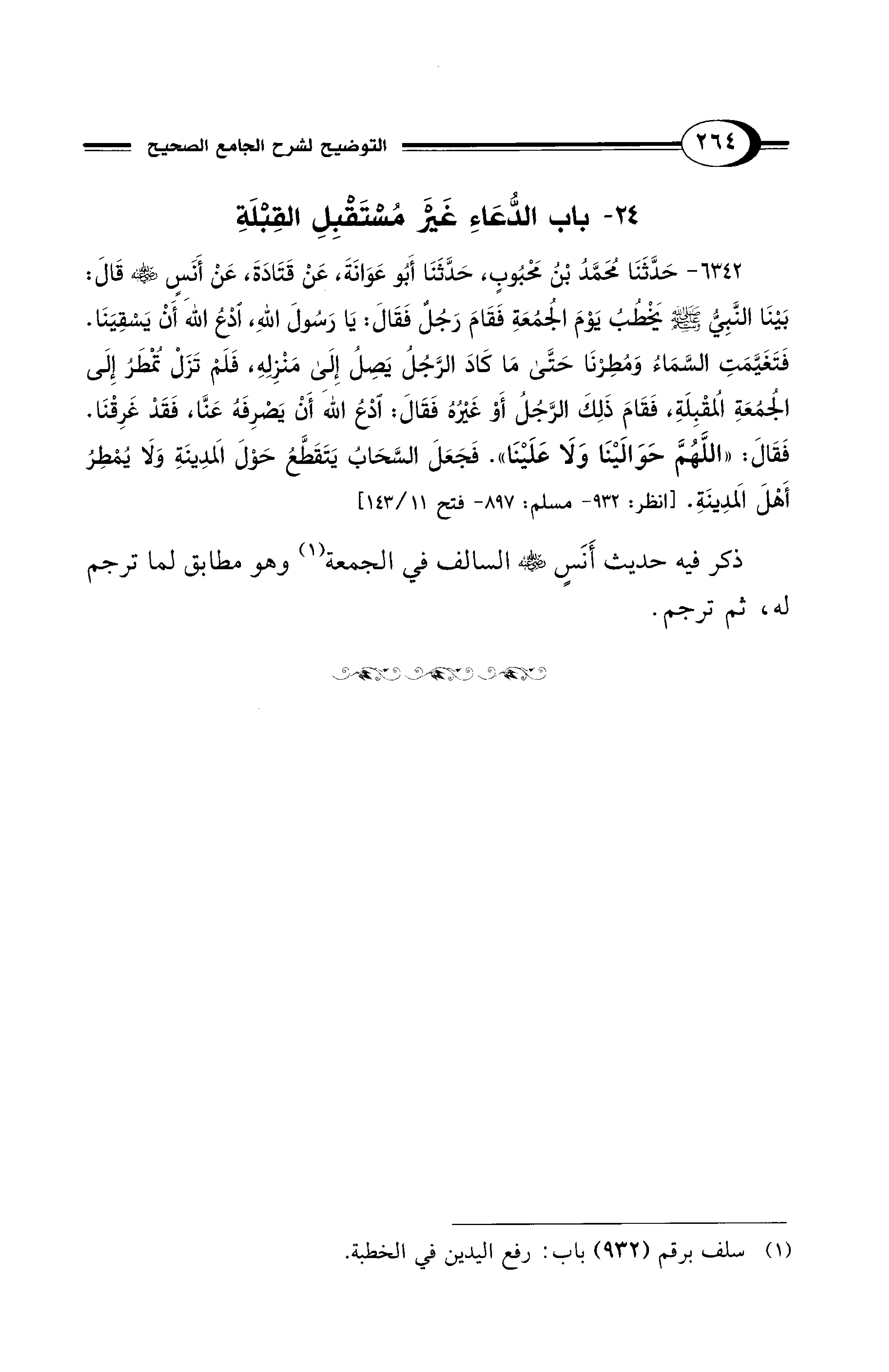 6342 - حَدَّثَنَا مُحَمَّدُ بْنُ مَحْبُوبٍ، حَدَّثَنَا أَبُو عَوَانَةَ، عَنْ قَتَادَةَ، عَنْ أَنَسٍ - رضي الله عنه - قَالَ: بَيْنَا النَّبِيُّ - صلى الله عليه وسلم - يَخْطُبُ يَوْمَ الجُمُعَةِ فَقَامَ رَجُلٌ فَقَالَ: يَا رَسُولَ اللهِ، ادْعُ اللهَ أَنْ يَسْقِيَنَا. فَتَغَيَّمَتِ السَّمَاءُ وَمُطِرْنَا حَتَّى مَا كَادَ الرَّجُلُ يَصِلُ إِلَى مَنْزِلِهِ، فَلَمْ تَزَلْ تُمْطَرُ إِلَى الْجُمُعَةِ الْمُقْبِلَةِ، فَقَامَ ذَلِكَ الرَّجُلُ أَوْ غَيْرُهُ فَقَالَ: ادْعُ اللهَ أَنْ يَصْرِفَهُ عَنَّا، فَقَدْ غَرِقْنَا. فَقَالَ: «اللَّهُمَّ حَوَالَيْنَا وَلاَ عَلَيْنَا». فَجَعَلَ السَّحَابُ يَتَقَطَّعُ حَوْلَ الْمَدِينَةِ وَلاَ يُمْطِرُ أَهْلَ الْمَدِينَةِ. [انظر: 932 - مسلم: 897 - فتح 11/ 143]