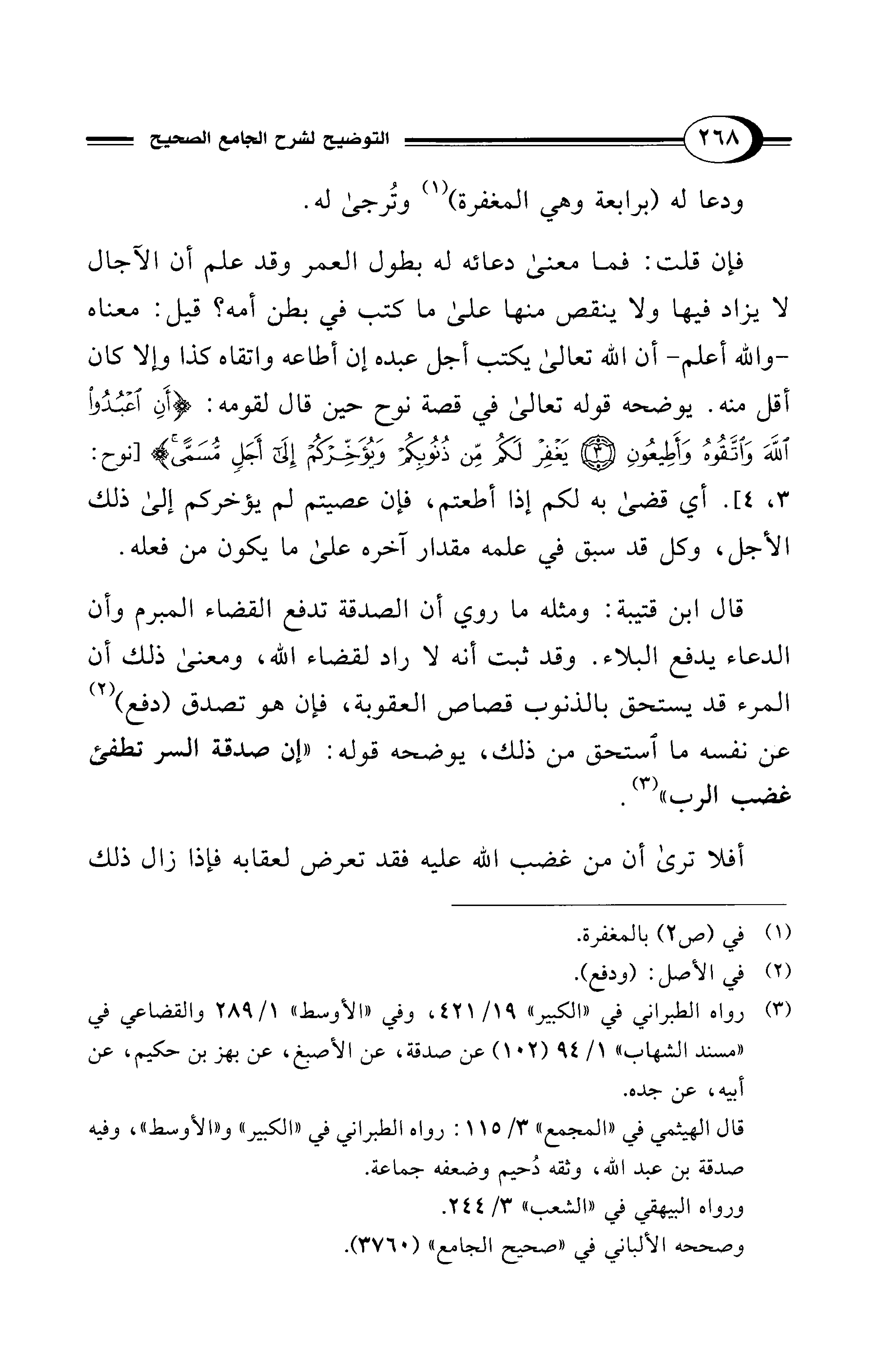 قال ابن قتيبة: ومثله ما روي أن الصدقة تدفع القضاء المبرم وأن الدعاء يدفع البلاء. وقد ثبت أنه لا راد لقضاء الله، ومعنى ذلك أن المرء قد يستحق بالذنوب قصاص العقوبة، فإن هو تصدق (دفع) (¬2) عن نفسه ما استحق من ذلك، يوضحه قوله: "إن صدقة السر تطفئ غضب الرب" (¬3).